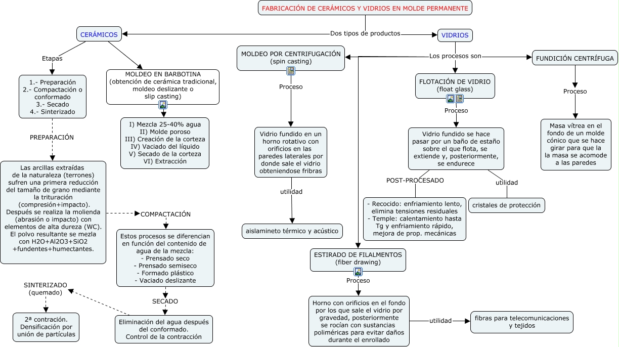 Este Cmap, tiene información relacionada con: FABRICACIÓN DE CERÁMICOS Y VIDRIOS EN MOLDE PERMANENTE, FLOTACIÓN DE VIDRIO (float glass) Proceso Vidrio fundido se hace pasar por un baño de estaño sobre el que flota, se extiende y, posteriormente, se endurece, Vidrio fundido se hace pasar por un baño de estaño sobre el que flota, se extiende y, posteriormente, se endurece POST-PROCESADO - Recocido: enfriamiento lento, elimina tensiones residuales - Temple: calentamiento hasta Tg y enfriamiento rápido, mejora de prop. mecánicas, FABRICACIÓN DE CERÁMICOS Y VIDRIOS EN MOLDE PERMANENTE Dos tipos de productos CERÁMICOS, FABRICACIÓN DE CERÁMICOS Y VIDRIOS EN MOLDE PERMANENTE Dos tipos de productos VIDRIOS, 1.- Preparación 2.- Compactación o conformado 3.- Secado 4.- Sinterizado PREPARACIÓN Las arcillas extraídas de la naturaleza (terrones) sufren una primera reducción del tamaño de grano mediante la trituración (compresión+impacto). Después se realiza la molienda (abrasión o impacto) con elementos de alta dureza (WC). El polvo resultante se mezla con H2O+Al2O3+SiO2 +fundentes+humectantes., Eliminación del agua después del conformado. Control de la contracción SINTERIZADO (quemado) 2ª contración. Densificación por unión de partículas, VIDRIOS Los procesos son ESTIRADO DE FILALMENTOS (fiber drawing), CERÁMICOS Etapas 1.- Preparación 2.- Compactación o conformado 3.- Secado 4.- Sinterizado, VIDRIOS Los procesos son FUNDICIÓN CENTRÍFUGA, Las arcillas extraídas de la naturaleza (terrones) sufren una primera reducción del tamaño de grano mediante la trituración (compresión+impacto). Después se realiza la molienda (abrasión o impacto) con elementos de alta dureza (WC). El polvo resultante se mezla con H2O+Al2O3+SiO2 +fundentes+humectantes. COMPACTACIÓN Estos procesos se diferencian en función del contenido de agua de la mezcla: - Prensado seco - Prensado semiseco - Formado plástico - Vaciado deslizante, ESTIRADO DE FILALMENTOS (fiber drawing) Proceso Horno con orificios en el fondo por los que sale el vidrio por gravedad, posteriormente se rocían con sustancias poliméricas para evitar daños durante el enrollado, CERÁMICOS MOLDEO EN BARBOTINA (obtención de cerámica tradicional, moldeo deslizante o slip casting) I) Mezcla 25-40% agua II) Molde poroso III) Creación de la corteza IV) Vaciado del líquido V) Secado de la corteza VI) Extracción, MOLDEO POR CENTRIFUGACIÓN (spin casting) Proceso Vidrio fundido en un horno rotativo con orificios en las paredes laterales por donde sale el vidrio obteniendose fribras, VIDRIOS Los procesos son FLOTACIÓN DE VIDRIO (float glass), VIDRIOS Los procesos son MOLDEO POR CENTRIFUGACIÓN (spin casting), Horno con orificios en el fondo por los que sale el vidrio por gravedad, posteriormente se rocían con sustancias poliméricas para evitar daños durante el enrollado utilidad fibras para telecomunicaciones y tejidos, FUNDICIÓN CENTRÍFUGA Proceso Masa vítrea en el fondo de un molde cónico que se hace girar para que la la masa se acomode a las paredes, Vidrio fundido en un horno rotativo con orificios en las paredes laterales por donde sale el vidrio obteniendose fribras utilidad aislamineto térmico y acústico, Estos procesos se diferencian en función del contenido de agua de la mezcla: - Prensado seco - Prensado semiseco - Formado plástico - Vaciado deslizante SECADO Eliminación del agua después del conformado. Control de la contracción, Vidrio fundido se hace pasar por un baño de estaño sobre el que flota, se extiende y, posteriormente, se endurece utilidad cristales de protección