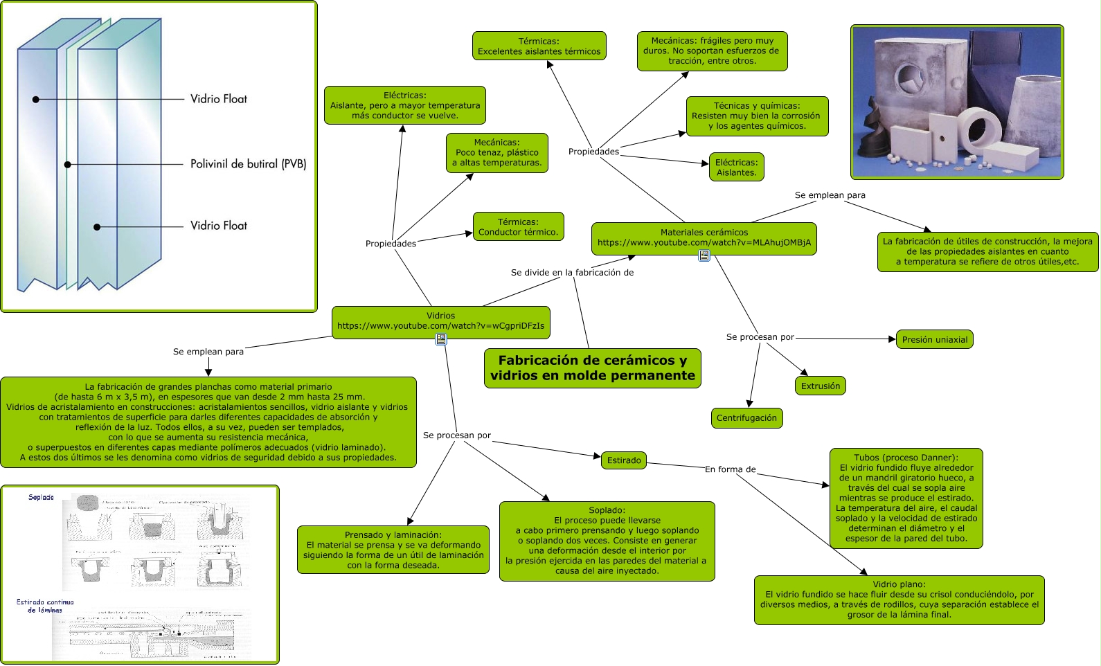 Este Cmap, tiene información relacionada con: José María Pérez Martínez, Vidrios https://www.youtube.com/watch?v=wCgpriDFzIs Se procesan por Prensado y laminación: El material se prensa y se va deformando siguiendo la forma de un útil de laminación con la forma deseada., Materiales cerámicos https://www.youtube.com/watch?v=MLAhujOMBjA Se procesan por Centrifugación, Fabricación de cerámicos y vidrios en molde permanente Se divide en la fabricación de Materiales cerámicos https://www.youtube.com/watch?v=MLAhujOMBjA, Estirado En forma de Vidrio plano: El vidrio fundido se hace fluir desde su crisol conduciéndolo, por diversos medios, a través de rodillos, cuya separación establece el grosor de la lámina final., Vidrios https://www.youtube.com/watch?v=wCgpriDFzIs Se procesan por Soplado: El proceso puede llevarse a cabo primero prensando y luego soplando o soplando dos veces. Consiste en generar una deformación desde el interior por la presión ejercida en las paredes del material a causa del aire inyectado., Vidrios https://www.youtube.com/watch?v=wCgpriDFzIs Se emplean para La fabricación de grandes planchas como material primario (de hasta 6 m x 3,5 m), en espesores que van desde 2 mm hasta 25 mm. Vidrios de acristalamiento en construcciones: acristalamientos sencillos, vidrio aislante y vidrios con tratamientos de superficie para darles diferentes capacidades de absorción y reflexión de la luz. Todos ellos, a su vez, pueden ser templados, con lo que se aumenta su resistencia mecánica, o superpuestos en diferentes capas mediante polímeros adecuados (vidrio laminado). A estos dos últimos se les denomina como vidrios de seguridad debido a sus propiedades., Estirado En forma de Tubos (proceso Danner): El vidrio fundido fluye alrededor de un mandril giratorio hueco, a través del cual se sopla aire mientras se produce el estirado. La temperatura del aire, el caudal soplado y la velocidad de estirado determinan el diámetro y el espesor de la pared del tubo., Materiales cerámicos https://www.youtube.com/watch?v=MLAhujOMBjA Propiedades Técnicas y químicas: Resisten muy bien la corrosión y los agentes químicos., Vidrios https://www.youtube.com/watch?v=wCgpriDFzIs Propiedades Mecánicas: Poco tenaz, plástico a altas temperaturas., Materiales cerámicos https://www.youtube.com/watch?v=MLAhujOMBjA Propiedades Mecánicas: frágiles pero muy duros. No soportan esfuerzos de tracción, entre otros., Materiales cerámicos https://www.youtube.com/watch?v=MLAhujOMBjA Se emplean para La fabricación de útiles de construcción, la mejora de las propiedades aislantes en cuanto a temperatura se refiere de otros útiles,etc., Materiales cerámicos https://www.youtube.com/watch?v=MLAhujOMBjA Se procesan por Extrusión, Fabricación de cerámicos y vidrios en molde permanente Se divide en la fabricación de Vidrios https://www.youtube.com/watch?v=wCgpriDFzIs, Vidrios https://www.youtube.com/watch?v=wCgpriDFzIs Propiedades Eléctricas: Aislante, pero a mayor temperatura más conductor se vuelve., Materiales cerámicos https://www.youtube.com/watch?v=MLAhujOMBjA Propiedades Térmicas: Excelentes aislantes térmicos, Materiales cerámicos https://www.youtube.com/watch?v=MLAhujOMBjA Se procesan por Presión uniaxial, Vidrios https://www.youtube.com/watch?v=wCgpriDFzIs Propiedades Térmicas: Conductor térmico., Materiales cerámicos https://www.youtube.com/watch?v=MLAhujOMBjA Propiedades Eléctricas: Aislantes., Vidrios https://www.youtube.com/watch?v=wCgpriDFzIs Se procesan por Estirado