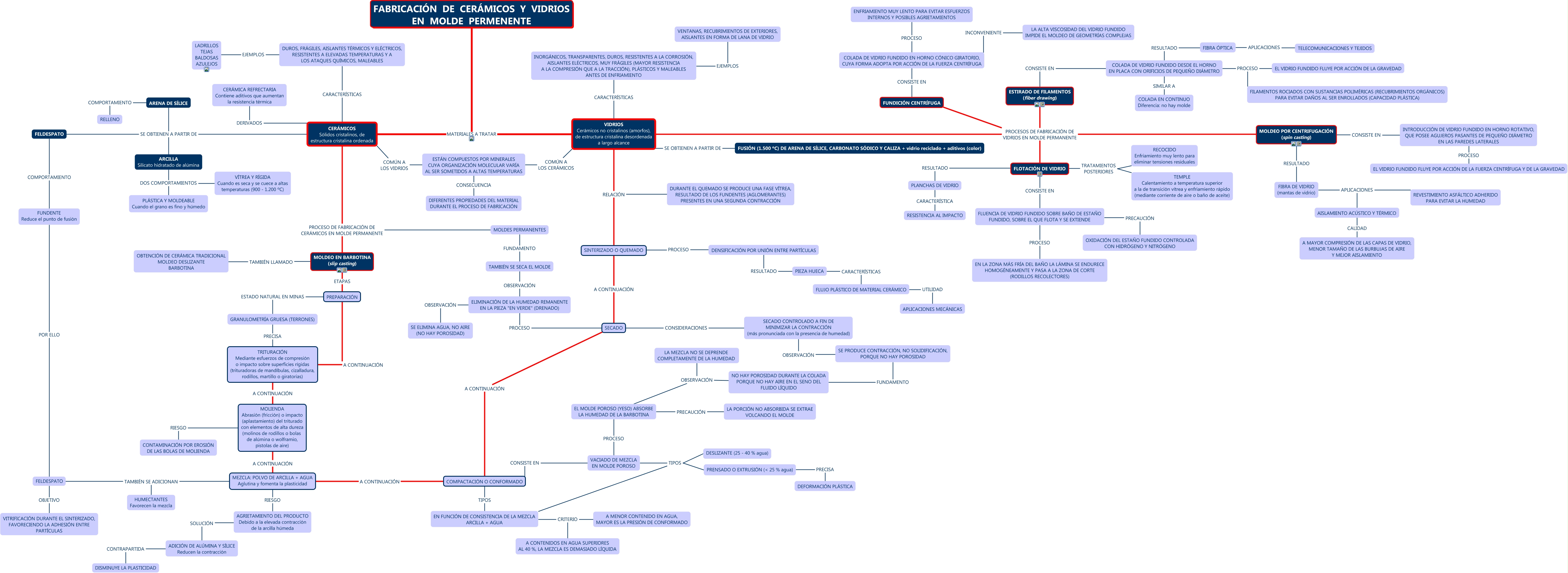 Este Cmap, tiene información relacionada con: María Elena Ferradás Echeveste, ARCILLA Silicato hidratado de alúmina DOS COMPORTAMIENTOS PLÁSTICA Y MOLDEABLE Cuando el grano es fino y húmedo, ARENA DE SÍLICE COMPORTAMIENTO RELLENO, FELDESPATO OBJETIVO VITRIFICACIÓN DURANTE EL SINTERIZADO, FAVORECIENDO LA ADHESIÓN ENTRE PARTÍCULAS, PRENSADO O EXTRUSIÓN (< 25 % agua) PRECISA DEFORMACIÓN PLÁSTICA, FELDESPATO SE OBTIENEN A PARTIR DE ARCILLA Silicato hidratado de alúmina, FLOTACIÓN DE VIDRIO CONSISTE EN FLUENCIA DE VIDRIO FUNDIDO SOBRE BAÑO DE ESTAÑO FUNDIDO, SOBRE EL QUE FLOTA Y SE EXTIENDE, FUNDENTE Reduce el punto de fusión POR ELLO FELDESPATO, VIDRIOS Cerámicos no cristalinos (amorfos), de estructura cristalina desordenada a largo alcance RELACIÓN SINTERIZADO O QUEMADO, ADICIÓN DE ALÚMINA Y SÍLICE Reducen la contracción CONTRAPARTIDA DISMINUYE LA PLASTICIDAD, FLOTACIÓN DE VIDRIO RESULTADO PLANCHAS DE VIDRIO, MEZCLA: POLVO DE ARCILLA + AGUA Aglutina y fomenta la plasticidad RIESGO AGRIETAMIENTO DEL PRODUCTO Debido a la elevada contracción de la arcilla húmeda, MOLIENDA Abrasión (fricción) o impacto (aplastamiento) del triturado con elementos de alta dureza (molinos de rodillos o bolas de alúmina o wolframio, pistolas de aire) A CONTINUACIÓN MEZCLA: POLVO DE ARCILLA + AGUA Aglutina y fomenta la plasticidad, FLUENCIA DE VIDRIO FUNDIDO SOBRE BAÑO DE ESTAÑO FUNDIDO, SOBRE EL QUE FLOTA Y SE EXTIENDE PRECAUCIÓN OXIDACIÓN DEL ESTAÑO FUNDIDO CONTROLADA CON HIDRÓGENO Y NITRÓGENO, DESLIZANTE (25 - 40 % agua) TIPOS EN FUNCIÓN DE CONSISTENCIA DE LA MEZCLA ARCILLA + AGUA, INTRODUCCIÓN DE VIDRIO FUNDIDO EN HORNO ROTATIVO, QUE POSEE AGUJEROS PASANTES DE PEQUEÑO DIÁMETRO EN LAS PAREDES LATERALES PROCESO EL VIDRIO FUNDIDO FLUYE POR ACCIÓN DE LA FUERZA CENTRÍFUGA Y DE LA GRAVEDAD, MOLDES PERMANENTES PROCESO DE FABRICACIÓN DE CERÁMICOS EN MOLDE PERMANENTE MOLDEO EN BARBOTINA (slip casting), FUNDICIÓN CENTRÍFUGA PROCESOS DE FABRICACIÓN DE VIDRIOS EN MOLDE PERMANENTE FLOTACIÓN DE VIDRIO, TRITURACIÓN Mediante esfuerzos de compresión o impacto sobre superficies rígidas (trituradoras de mandíbulas, cizalladura, rodillos, martillo o giratorias) A CONTINUACIÓN MOLIENDA Abrasión (fricción) o impacto (aplastamiento) del triturado con elementos de alta dureza (molinos de rodillos o bolas de alúmina o wolframio, pistolas de aire), EL VIDRIO FUNDIDO FLUYE POR ACCIÓN DE LA GRAVEDAD PROCESO FILAMENTOS ROCIADOS CON SUSTANCIAS POLIMÉRICAS (RECUBRIMIENTOS ORGÁNICOS) PARA EVITAR DAÑOS AL SER ENROLLADOS (CAPACIDAD PLÁSTICA), FLUENCIA DE VIDRIO FUNDIDO SOBRE BAÑO DE ESTAÑO FUNDIDO, SOBRE EL QUE FLOTA Y SE EXTIENDE PROCESO EN LA ZONA MÁS FRÍA DEL BAÑO LA LÁMINA SE ENDURECE HOMOGÉNEAMENTE Y PASA A LA ZONA DE CORTE (RODILLOS RECOLECTORES)