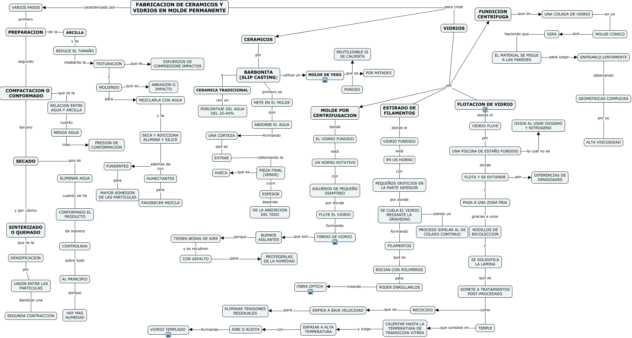 Este Cmap, tiene información relacionada con: Formacion de ceramicos y vidrios, RELACION ENTRE AGUA Y ARCILLA cuanto MENOS AGUA, ABSORBE EL AGUA formando UNA CORTEZA, FLUYE EL VIDRIO formando FIBRAS DE VIDRIO, SECADO y por ultimo SINTERIZADO O QUEMADO, UNA PISCINA DE ESTAÑO FUNDIDO la cual no se OXIDA AL USAR OXIGENO Y NITROGENO, FABRICACION DE CERAMICOS Y VIDRIOS EN MOLDE PERMANENTE para crear CERAMICOS, COMPACTACION O CONFORMADO que es la RELACION ENTRE AGUA Y ARCILLA, BUENOS AISLANTES porque TIENEN BOSAS DE AIRE, FLOTA Y SE EXTIENDE y PASA A UNA ZONA FRIA, VIDRIOS por FLOTACION DE VIDRIO, VIDRIOS por FUNDICION CENTRIFUGA, ROCIAN CON POLIMEROS para PODER ENROLLARLOS, COMPACTACION O CONFORMADO tercero SECADO, TEMPLE que consiste en CALENTAR HASTA LA TEMPERATURA DE TRANSICION VITREA, BARBONITA (SLIP CASTING) primero se METE EN EL MOLDE, CONFORMADO EL PRODUCTO de manera CONTROLADA, AIRE O ACEITA formando VIDRIO TEMPLADO, CONTROLADA sobre todo AL PRINCIPIO, CERAMICOS por BARBONITA (SLIP CASTING), EL MATERIAL SE PEGUE A LAS PAREDES para luego ENFRIARLO LENTAMENTE