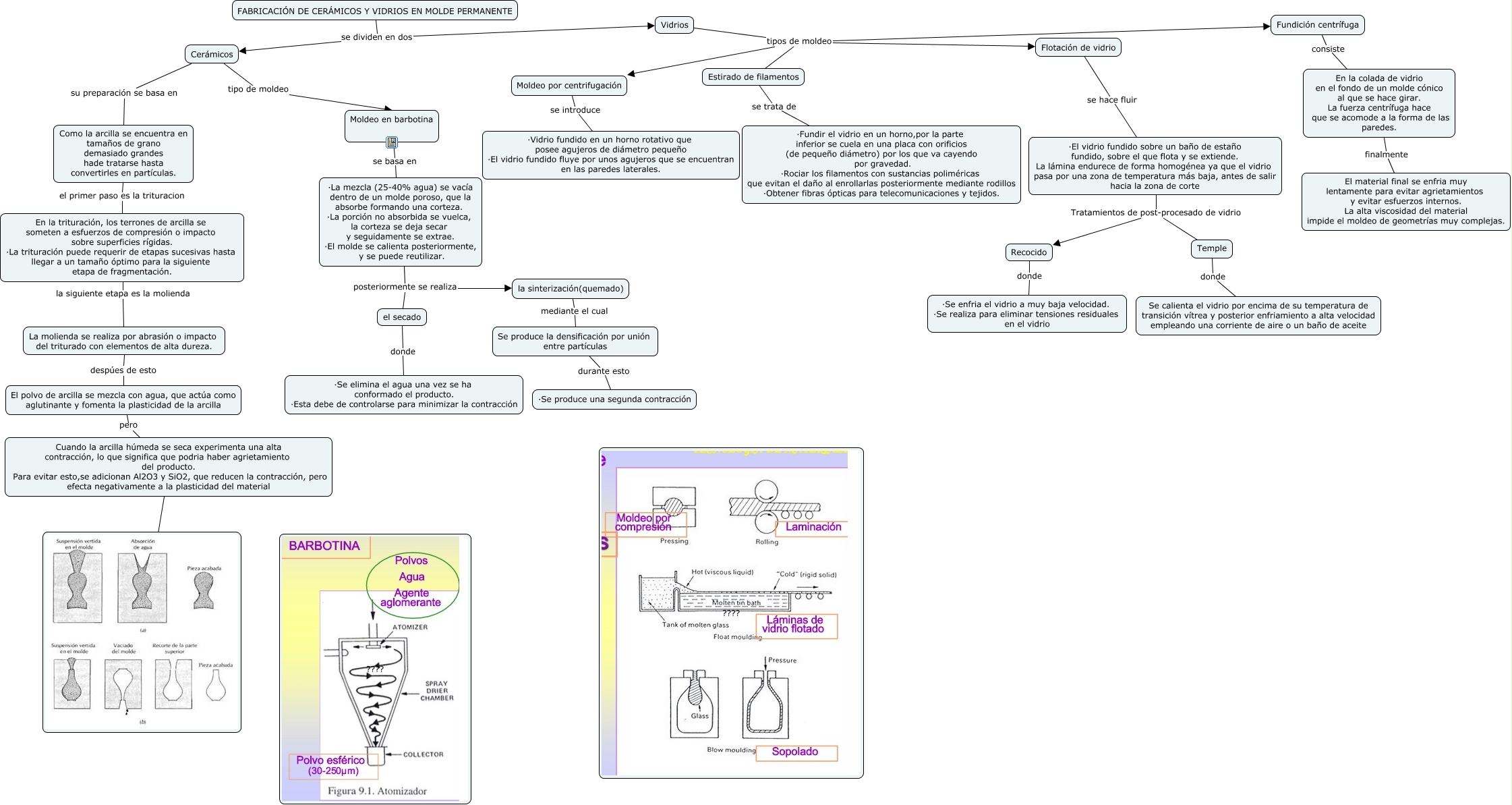 Este Cmap, tiene información relacionada con: VanessaParrasJolley-moldeoceramicossyvidrio, Moldeo en barbotina se basa en ·La mezcla (25-40% agua) se vacía dentro de un molde poroso, que la absorbe formando una corteza. ·La porción no absorbida se vuelca, la corteza se deja secar y seguidamente se extrae. ·El molde se calienta posteriormente, y se puede reutilizar., Vidrios tipos de moldeo Moldeo por centrifugación, FABRICACIÓN DE CERÁMICOS Y VIDRIOS EN MOLDE PERMANENTE se dividen en dos Cerámicos, Se produce la densificación por unión entre partículas durante esto ·Se produce una segunda contracción, Estirado de filamentos se trata de ·Fundir el vidrio en un horno,por la parte inferior se cuela en una placa con orificios (de pequeño diámetro) por los que va cayendo por gravedad. ·Rociar los filamentos con sustancias poliméricas que evitan el daño al enrollarlas posteriormente mediante rodillos ·Obtener fibras ópticas para telecomunicaciones y tejidos., La molienda se realiza por abrasión o impacto del triturado con elementos de alta dureza. despúes de esto El polvo de arcilla se mezcla con agua, que actúa como aglutinante y fomenta la plasticidad de la arcilla, ·La mezcla (25-40% agua) se vacía dentro de un molde poroso, que la absorbe formando una corteza. ·La porción no absorbida se vuelca, la corteza se deja secar y seguidamente se extrae. ·El molde se calienta posteriormente, y se puede reutilizar. posteriormente se realiza la sinterización(quemado), Cuando la arcilla húmeda se seca experimenta una alta contracción, lo que significa que podria haber agrietamiento del producto. Para evitar esto,se adicionan Al2O3 y SiO2, que reducen la contracción, pero efecta negativamente a la plasticidad del material ????, Moldeo por centrifugación se introduce ·Vidrio fundido en un horno rotativo que posee agujeros de diámetro pequeño ·El vidrio fundido fluye por unos agujeros que se encuentran en las paredes laterales., El polvo de arcilla se mezcla con agua, que actúa como aglutinante y fomenta la plasticidad de la arcilla pero Cuando la arcilla húmeda se seca experimenta una alta contracción, lo que significa que podria haber agrietamiento del producto. Para evitar esto,se adicionan Al2O3 y SiO2, que reducen la contracción, pero efecta negativamente a la plasticidad del material, Vidrios tipos de moldeo Estirado de filamentos, Vidrios tipos de moldeo Fundición centrífuga, Fundición centrífuga consiste En la colada de vidrio en el fondo de un molde cónico al que se hace girar. La fuerza centrífuga hace que se acomode a la forma de las paredes., En la trituración, los terrones de arcilla se someten a esfuerzos de compresión o impacto sobre superficies rígidas. ·La trituración puede requerir de etapas sucesivas hasta llegar a un tamaño óptimo para la siguiente etapa de fragmentación. la siguiente etapa es la molienda La molienda se realiza por abrasión o impacto del triturado con elementos de alta dureza., Flotación de vidrio se hace fluir ·El vidrio fundido sobre un baño de estaño fundido, sobre el que flota y se extiende. La lámina endurece de forma homogénea ya que el vidrio pasa por una zona de temperatura más baja, antes de salir hacia la zona de corte, Recocido donde ·Se enfria el vidrio a muy baja velocidad. ·Se realiza para eliminar tensiones residuales en el vidrio, Cerámicos tipo de moldeo Moldeo en barbotina, el secado donde ·Se elimina el agua una vez se ha conformado el producto. ·Esta debe de controlarse para minimizar la contracción, FABRICACIÓN DE CERÁMICOS Y VIDRIOS EN MOLDE PERMANENTE se dividen en dos Vidrios, la sinterización(quemado) mediante el cual Se produce la densificación por unión entre partículas