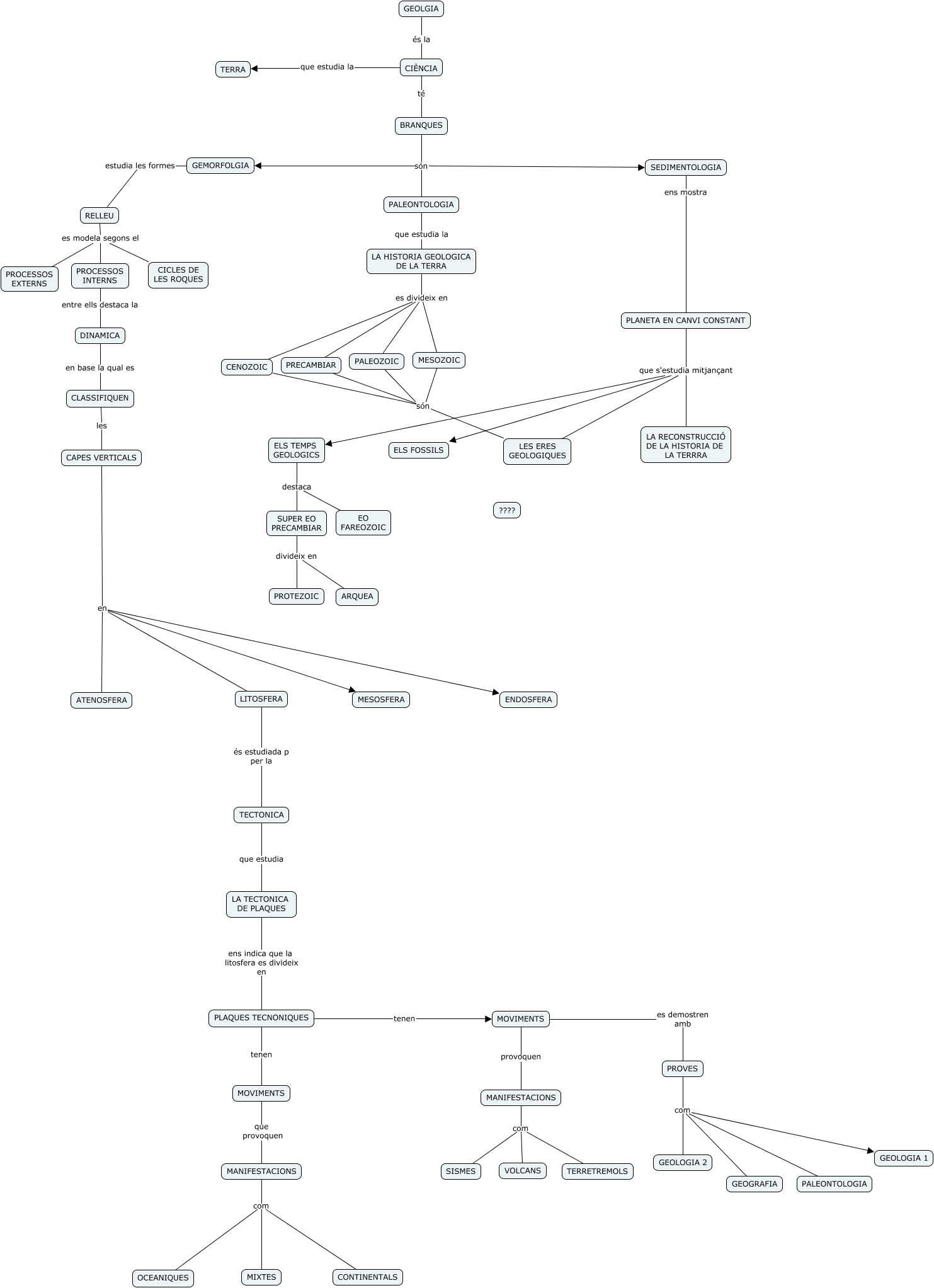 Este Cmap, tiene información relacionada con: GEOLOGIA ACALAFELL JDEHARO, LA TECTONICA DE PLAQUES ens indica que la litosfera es divideix en PLAQUES TECNONIQUES, LA HISTORIA GEOLOGICA DE LA TERRA es divideix en PRECAMBIAR, RELLEU es modela segons el PROCESSOS EXTERNS, MESOZOIC són LES ERES GEOLOGIQUES, LA HISTORIA GEOLOGICA DE LA TERRA es divideix en MESOZOIC, PROVES com GEOGRAFIA, ELS TEMPS GEOLOGICS destaca SUPER EO PRECAMBIAR, LITOSFERA és estudiada p per la TECTONICA, RELLEU es modela segons el PROCESSOS INTERNS, PLAQUES TECNONIQUES tenen MOVIMENTS, MANIFESTACIONS com CONTINENTALS, PRECAMBIAR són LES ERES GEOLOGIQUES, BRANQUES són SEDIMENTOLOGIA, ELS TEMPS GEOLOGICS destaca EO FAREOZOIC, PROVES com GEOLOGIA 1, CAPES VERTICALS en LITOSFERA, PROCESSOS INTERNS entre ells destaca la DINAMICA, MANIFESTACIONS com MIXTES, DINAMICA en base la qual es CLASSIFIQUEN, SUPER EO PRECAMBIAR divideix en PROTEZOIC