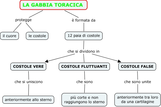 Questa Cmap, creata con IHMC CmapTools, contiene informazioni relative a: la gabbia toracica, COSTOLE FLUTTUANTI che sono più corte e non raggiungono lo sterno, LA GABBIA TORACICA protegge le costole, LA GABBIA TORACICA è formata da 12 paia di costole, COSTOLE VERE che si uniscono anteriormente allo sterno, LA GABBIA TORACICA protegge il cuore, 12 paia di costole che si dividono in COSTOLE FLUTTUANTI, 12 paia di costole che si dividono in COSTOLE VERE, 12 paia di costole che si dividono in COSTOLE FALSE, COSTOLE FALSE che sono unite anteriormente tra loro da una cartilagine