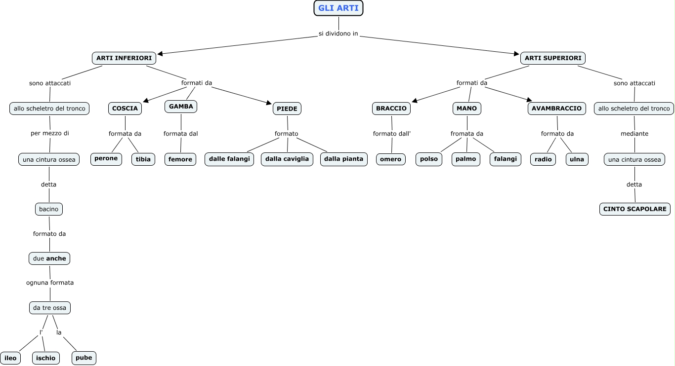 Questa Cmap, creata con IHMC CmapTools, contiene informazioni relative a: gli arti, AVAMBRACCIO formato da radio, ARTI INFERIORI formati da COSCIA, GLI ARTI si dividono in ARTI INFERIORI, ARTI SUPERIORI formati da BRACCIO, BRACCIO formato dall' omero, AVAMBRACCIO formato da ulna, una cintura ossea detta CINTO SCAPOLARE, allo scheletro del tronco per mezzo di una cintura ossea, ARTI INFERIORI formati da GAMBA, da tre ossa l' ileo, PIEDE formato dalla caviglia, GAMBA formata dal femore, MANO fromata da polso, ARTI INFERIORI formati da PIEDE, COSCIA formata da tibia, ARTI INFERIORI sono attaccati allo scheletro del tronco, PIEDE formato dalla pianta, allo scheletro del tronco mediante una cintura ossea, bacino formato da due anche, due anche ognuna formata da tre ossa