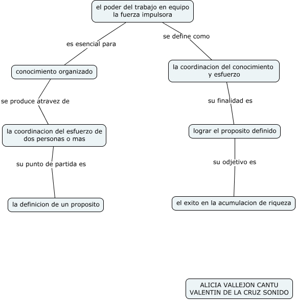 Este Cmap, tiene información relacionada con: ALICIA-VALLEJON-CANTU-MAPA7.cmap, lograr el proposito definido su odjetivo es el exito en la acumulacion de riqueza, el poder del trabajo en equipo la fuerza impulsora se define como la coordinacion del conocimiento y esfuerzo, conocimiento organizado se produce atravez de la coordinacion del esfuerzo de dos personas o mas, el poder del trabajo en equipo la fuerza impulsora es esencial para conocimiento organizado, la coordinacion del conocimiento y esfuerzo su finalidad es lograr el proposito definido, la coordinacion del esfuerzo de dos personas o mas su punto de partida es la definicion de un proposito