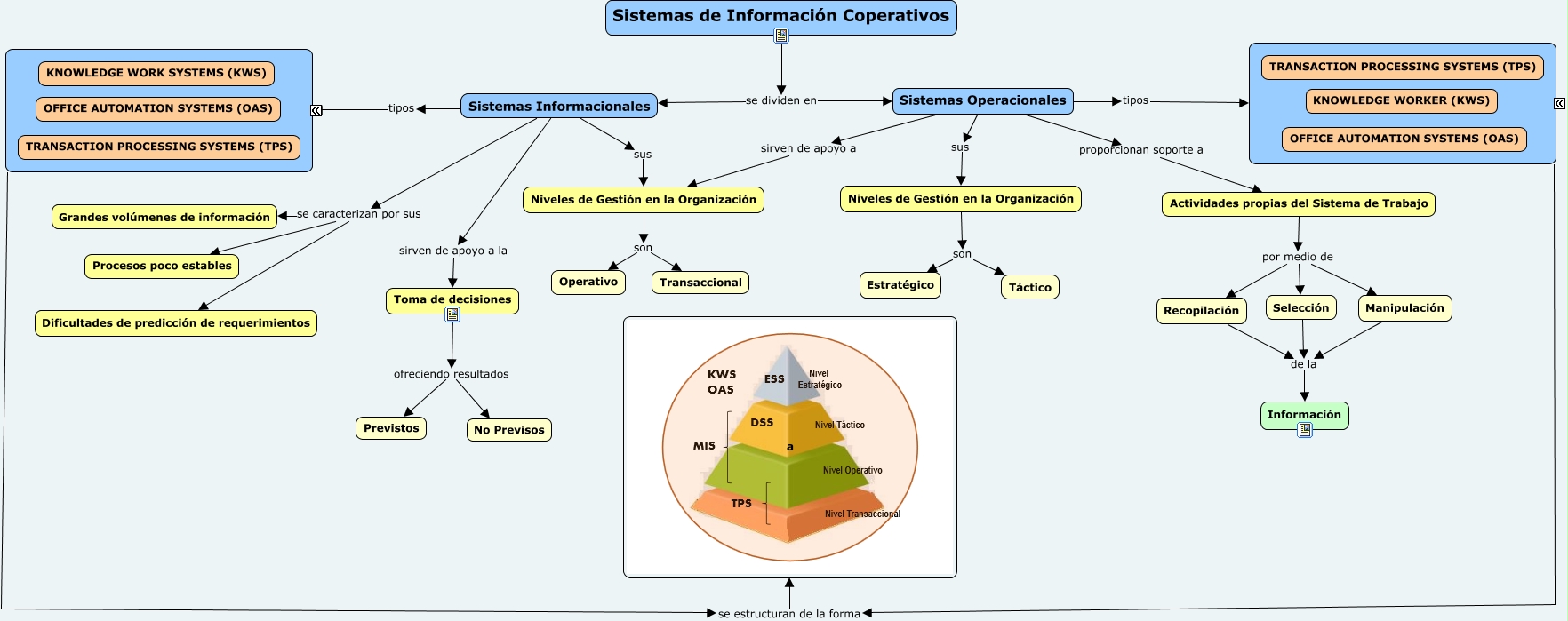 Este Cmap, tiene información relacionada con: Sistemas de Información Corporativos, Actividades propias del Sistema de Trabajo por medio de Manipulación, Toma de decisiones ofreciendo resultados Previstos, Niveles de Gestión en la Organización son Operativo, ???? se estructuran de la forma a, Niveles de Gestión en la Organización son Estratégico, Recopilación de la Información, Sistemas Informacionales se caracterizan por sus Grandes volúmenes de información, Actividades propias del Sistema de Trabajo por medio de Selección, ???? se estructuran de la forma a, Selección de la Información, Sistemas Operacionales tipos ????, Sistemas de Información Coperativos se dividen en Sistemas Informacionales, Niveles de Gestión en la Organización son Táctico, Sistemas Informacionales tipos ????, Sistemas Informacionales sirven de apoyo a la Toma de decisiones, Manipulación de la Información, Sistemas Operacionales proporcionan soporte a Actividades propias del Sistema de Trabajo, Sistemas Operacionales sirven de apoyo a Niveles de Gestión en la Organización, Actividades propias del Sistema de Trabajo por medio de Recopilación, Toma de decisiones ofreciendo resultados No Previsos