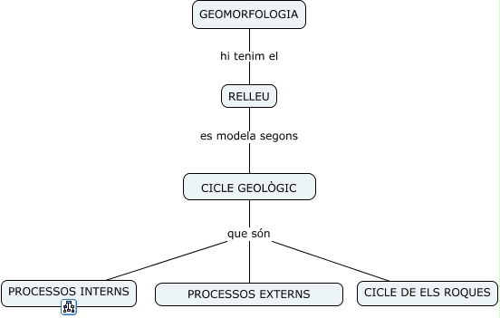 Este Cmap, tiene información relacionada con: Geomorfologia, GEOMORFOLOGIA hi tenim el RELLEU, CICLE GEOLÒGIC que són PROCESSOS INTERNS, CICLE GEOLÒGIC que són CICLE DE ELS ROQUES, CICLE GEOLÒGIC que són PROCESSOS EXTERNS, RELLEU es modela segons CICLE GEOLÒGIC