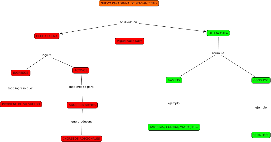 Este Cmap, tiene información relacionada con: Miguel_Valle_mapa 3, NUEVO PARADIGMA DE PENSAMIENTO se divide en DEUDA BUENA, ACTIVOS todo credito para: ADQUIRIR BIENES, DEUDA BUENA ingiere INGRESOS, ADQUIRIR BIENES que producen: INGRESOS ADICIONALES, DEUDA BUENA ingiere ACTIVOS, GASTOS ejemplo TARJETAS, COMIDA, VIAJES, ETC, NUEVO PARADIGMA DE PENSAMIENTO se divide en DEUDA MALA, DEUDA MALA acumula CONSUMO, CONSUMO ejemplo CREDITOS, DEUDA MALA acumula GASTOS, INGRESOS todo ingreso que: PROBIENE DE SU SUELDO