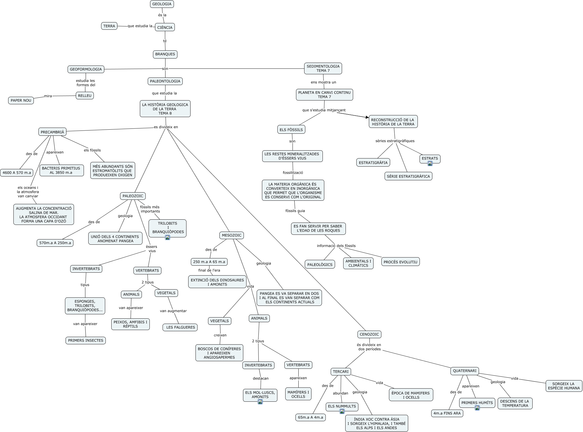 Este Cmap, tiene información relacionada con: BIO MAPA CONCEPTUAL TP, BRANQUES són SEDIMENTOLOGIA TEMA 7, VERTEBRATS 2 tipus ANIMALS, GEOFORMOLOGIA estudia les formes del RELLEU, ES FAN SERVIR PER SABER L'EDAD DE LES ROQUES informació dels fòssils PALEOLÒGICS, PRECAMBRIÀ els oceans i la atmosfera van canviar AUGMENTA LA CONCENTRACIÓ SALINA DE MAR. LA ATMOSFERA OCCIDANT FORMA UNA CAPA D'OZÓ, VEGETALS van augmentar LES FALGUERES, LA MATERIA ORGÀNICA ÉS CONVERTEIX EN INORGÀNICA QUE PERMET QUE L'ORGANISME ES CONSERVI COM L'ORIGINAL fòssils guia ES FAN SERVIR PER SABER L'EDAD DE LES ROQUES, GEOLOGIA és la CIÈNCIA, LA HISTÒRIA GEOLOGICA DE LA TERRA TEMA 8 es divideix en MESOZOIC, RECONSTRUCCIÓ DE LA HISTÒRIA DE LA TERRA sèries estratigràfiques ESTRATS, MESOZOIC vida VEGETALS, RECONSTRUCCIÓ DE LA HISTÒRIA DE LA TERRA sèries estratigràfiques ESTRATIGRÀFIA, SEDIMENTOLOGIA TEMA 7 ens mostra un PLANETA EN CANVI CONTINU TEMA 7, PRECAMBRIÀ apareixen BACTERIS PRIMITIUS AL 3850 m.a, PLANETA EN CANVI CONTINU TEMA 7 que s'estudia mitjançant RECONSTRUCCIÓ DE LA HISTÒRIA DE LA TERRA, LES RESTES MINERALITZADES D'ÈSSERS VIUS fossilització LA MATERIA ORGÀNICA ÉS CONVERTEIX EN INORGÀNICA QUE PERMET QUE L'ORGANISME ES CONSERVI COM L'ORIGINAL, 250 m.a A 65 m.a final de l'era EXTINCIÓ DELS DINOSAURES I AMONITS, ES FAN SERVIR PER SABER L'EDAD DE LES ROQUES informació dels fòssils AMBIENTALS I CLIMÀTICS, QUATERNARI geologia DESCENS DE LA TEMPERATURA, TERCARI geologia ÍNDIA XOC CONTRA ÀSIA I SORGEIX L'HIMALAIA, I TAMBÉ ELS ALPS I ELS ANDES
