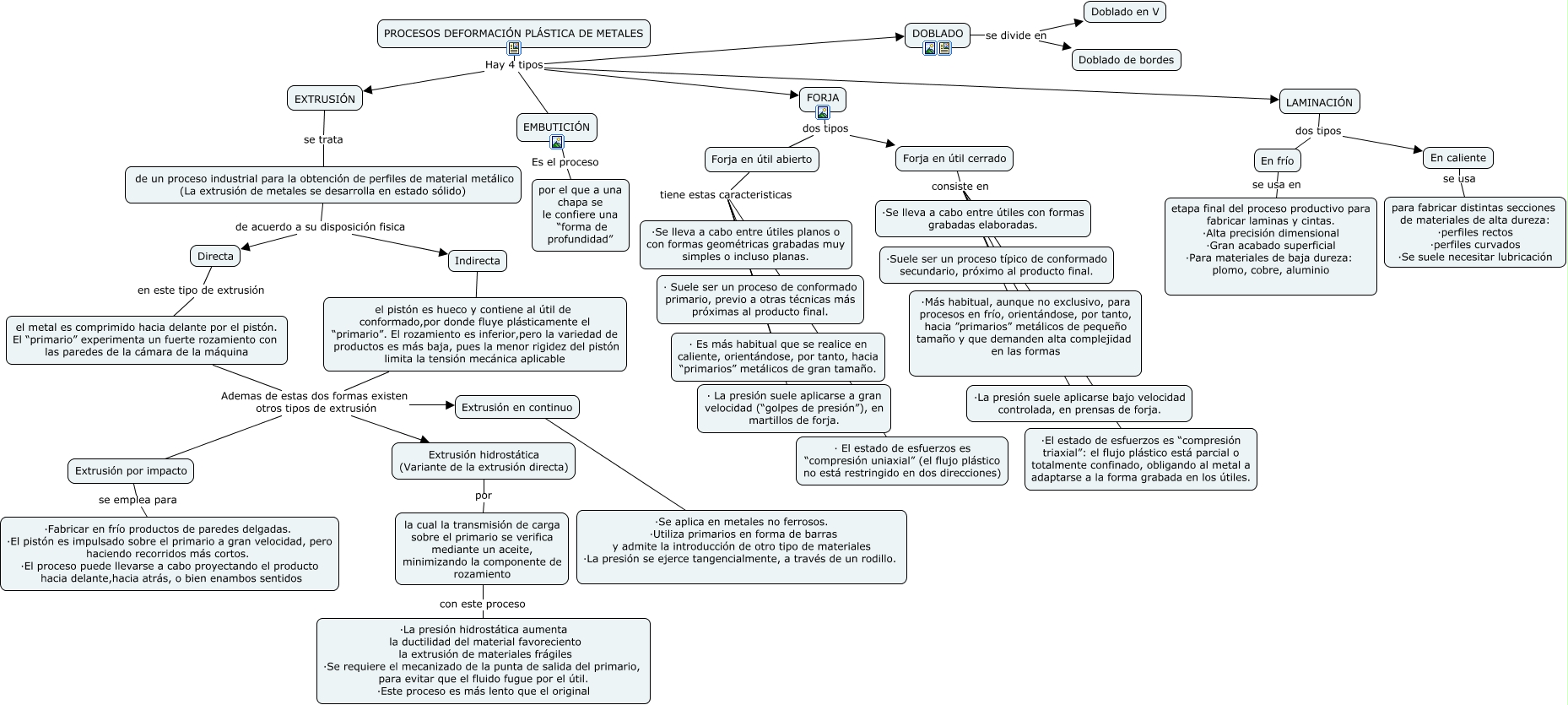 Este Cmap, tiene información relacionada con: Deformacion Plastica de metales-VanessaParrasJolley, Forja en útil abierto tiene estas caracteristicas · El estado de esfuerzos es “compresión uniaxial” (el flujo plástico no está restringido en dos direcciones), LAMINACIÓN dos tipos En caliente, el pistón es hueco y contiene al útil de conformado,por donde fluye plásticamente el “primario”. El rozamiento es inferior,pero la variedad de productos es más baja, pues la menor rigidez del pistón limita la tensión mecánica aplicable Ademas de estas dos formas existen otros tipos de extrusión Extrusión hidrostática (Variante de la extrusión directa), PROCESOS DEFORMACIÓN PLÁSTICA DE METALES Hay 4 tipos FORJA, el pistón es hueco y contiene al útil de conformado,por donde fluye plásticamente el “primario”. El rozamiento es inferior,pero la variedad de productos es más baja, pues la menor rigidez del pistón limita la tensión mecánica aplicable Ademas de estas dos formas existen otros tipos de extrusión Extrusión por impacto, el pistón es hueco y contiene al útil de conformado,por donde fluye plásticamente el “primario”. El rozamiento es inferior,pero la variedad de productos es más baja, pues la menor rigidez del pistón limita la tensión mecánica aplicable Ademas de estas dos formas existen otros tipos de extrusión Extrusión en continuo, de un proceso industrial para la obtención de perfiles de material metálico (La extrusión de metales se desarrolla en estado sólido) de acuerdo a su disposición fisica Indirecta, la cual la transmisión de carga sobre el primario se verifica mediante un aceite, minimizando la componente de rozamiento con este proceso ·La presión hidrostática aumenta la ductilidad del material favoreciento la extrusión de materiales frágiles ·Se requiere el mecanizado de la punta de salida del primario, para evitar que el fluido fugue por el útil. ·Este proceso es más lento que el original, Extrusión en continuo ???? ·Se aplica en metales no ferrosos. ·Utiliza primarios en forma de barras y admite la introducción de otro tipo de materiales ·La presión se ejerce tangencialmente, a través de un rodillo., Forja en útil cerrado consiste en ·Suele ser un proceso típico de conformado secundario, próximo al producto final., Forja en útil abierto tiene estas caracteristicas · La presión suele aplicarse a gran velocidad (“golpes de presión”), en martillos de forja., Extrusión por impacto se emplea para ·Fabricar en frío productos de paredes delgadas. ·El pistón es impulsado sobre el primario a gran velocidad, pero haciendo recorridos más cortos. ·El proceso puede llevarse a cabo proyectando el producto hacia delante,hacia atrás, o bien enambos sentidos, Forja en útil abierto tiene estas caracteristicas · Suele ser un proceso de conformado primario, previo a otras técnicas más próximas al producto final., FORJA dos tipos Forja en útil cerrado, EMBUTICIÓN Es el proceso por el que a una chapa se le confiere una “forma de profundidad”, Forja en útil cerrado consiste en ·La presión suele aplicarse bajo velocidad controlada, en prensas de forja., el metal es comprimido hacia delante por el pistón. El “primario” experimenta un fuerte rozamiento con las paredes de la cámara de la máquina Ademas de estas dos formas existen otros tipos de extrusión Extrusión por impacto, PROCESOS DEFORMACIÓN PLÁSTICA DE METALES Hay 4 tipos EMBUTICIÓN, DOBLADO se divide en Doblado de bordes, el metal es comprimido hacia delante por el pistón. El “primario” experimenta un fuerte rozamiento con las paredes de la cámara de la máquina Ademas de estas dos formas existen otros tipos de extrusión Extrusión hidrostática (Variante de la extrusión directa)