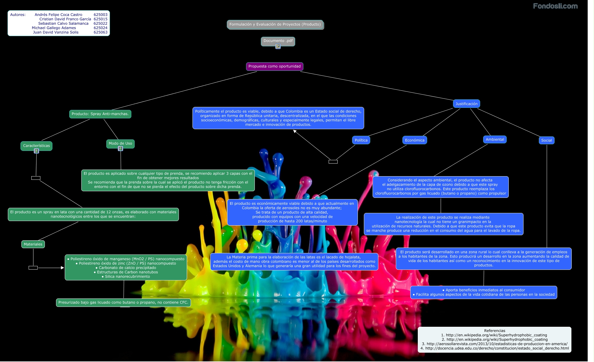 Este Cmap, tiene información relacionada con: Producto, Características ???? El producto es un spray en lata con una cantidad de 12 onzas, es elaborado con materiales nanotecnológicos entre los que se encuentran:, Política ???? Políticamente el producto es viable, debido a que Colombia es un Estado social de derecho, organizado en forma de República unitaria, descentralizada, en el que las condiciones socioeconómicas, demográficas, culturales y especialmente legales, permiten el libre mercado e innovación de productos., Justificación ???? Ambiental, Justificación ???? Política, Propuesta como oportunidad ???? Justificación, Justificación ???? Económica, Materiales ???? ● Poliestireno óxido de manganeso (MnO2 / PS) nanocompuesto ● Poliestireno óxido de zinc (ZnO / PS) nanocompuesto ● Carbonato de calcio precipitado ● Estructuras de Carbon nanotubos ● Silica nanorecubrimiento, Considerando el aspecto ambiental, el producto no afecta el adelgazamiento de la capa de ozono debido a que este spray no utiliza clorofluorocarbonos. Este producto reemplaza los clorofluorocarbonos por gas licuado (butano o propano) como propulsor ???? La realización de este producto se realiza mediante nanotecnología la cual no tiene un granimpacto en la utilización de recursos naturales. Debido a que este producto evita que la ropa se manche produce una reducción en el consumo del agua para el lavado de la ropa., Social ???? El producto será desarrollado en una zona rural lo cual conlleva a la generación de empleos a los habitantes de la zona. Esto producirá un desarrollo en la zona aumentando la calidad de vida de los habitantes así como un reconocimiento en la innovación de este tipo de productos., ● Poliestireno óxido de manganeso (MnO2 / PS) nanocompuesto ● Poliestireno óxido de zinc (ZnO / PS) nanocompuesto ● Carbonato de calcio precipitado ● Estructuras de Carbon nanotubos ● Silica nanorecubrimiento ???? Presurizado bajo gas licuado como butano o propano, no contiene CFC., El producto será desarrollado en una zona rural lo cual conlleva a la generación de empleos a los habitantes de la zona. Esto producirá un desarrollo en la zona aumentando la calidad de vida de los habitantes así como un reconocimiento en la innovación de este tipo de productos. ???? ● Aporta beneficios inmediatos al consumidor ● Facilita algunos aspectos de la vida cotidiana de las personas en la sociedad, Producto: Spray Anti-manchas. ???? Características, Justificación ???? Social, Producto: Spray Anti-manchas. ???? Modo de Uso, Propuesta como oportunidad ???? Producto: Spray Anti-manchas., Modo de Uso ???? El producto es aplicado sobre cualquier tipo de prenda, se recomiendo aplicar 3 capas con el fin de obtener mejores resultados Se recomienda que la prenda sobre la cual se aplicó el producto no tenga fricción con el entorno con el fin de que no se pierda el efecto del producto sobre dicha prenda., Ambiental ???? Considerando el aspecto ambiental, el producto no afecta el adelgazamiento de la capa de ozono debido a que este spray no utiliza clorofluorocarbonos. Este producto reemplaza los clorofluorocarbonos por gas licuado (butano o propano) como propulsor, El producto es un spray en lata con una cantidad de 12 onzas, es elaborado con materiales nanotecnológicos entre los que se encuentran: ???? Materiales, El producto es económicamente viable debido a que actualmente en Colombia la oferta de aerosoles no es muy abundante; Se trata de un producto de alta calidad, producido con equipos con una velocidad de producción de hasta 200 latas/minuto ???? La Materia prima para la elaboración de las latas es el lacado de hojalata, además el costo de mano obra colombiano es menor al de los países desarrollados como Estados Unidos y Alemania lo que generaría una gran utilidad para los fines del proyecto., Económica ???? El producto es económicamente viable debido a que actualmente en Colombia la oferta de aerosoles no es muy abundante; Se trata de un producto de alta calidad, producido con equipos con una velocidad de producción de hasta 200 latas/minuto