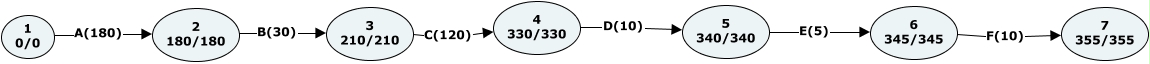 Este Cmap, tiene información relacionada con: PERT HITO6, 1 0/0 A(180) 2 180/180, 4 330/330 D(10) 5 340/340, 5 340/340 E(5) 6 345/345, 3 210/210 C(120) 4 330/330, 2 180/180 B(30) 3 210/210, 6 345/345 F(10) 7 355/355