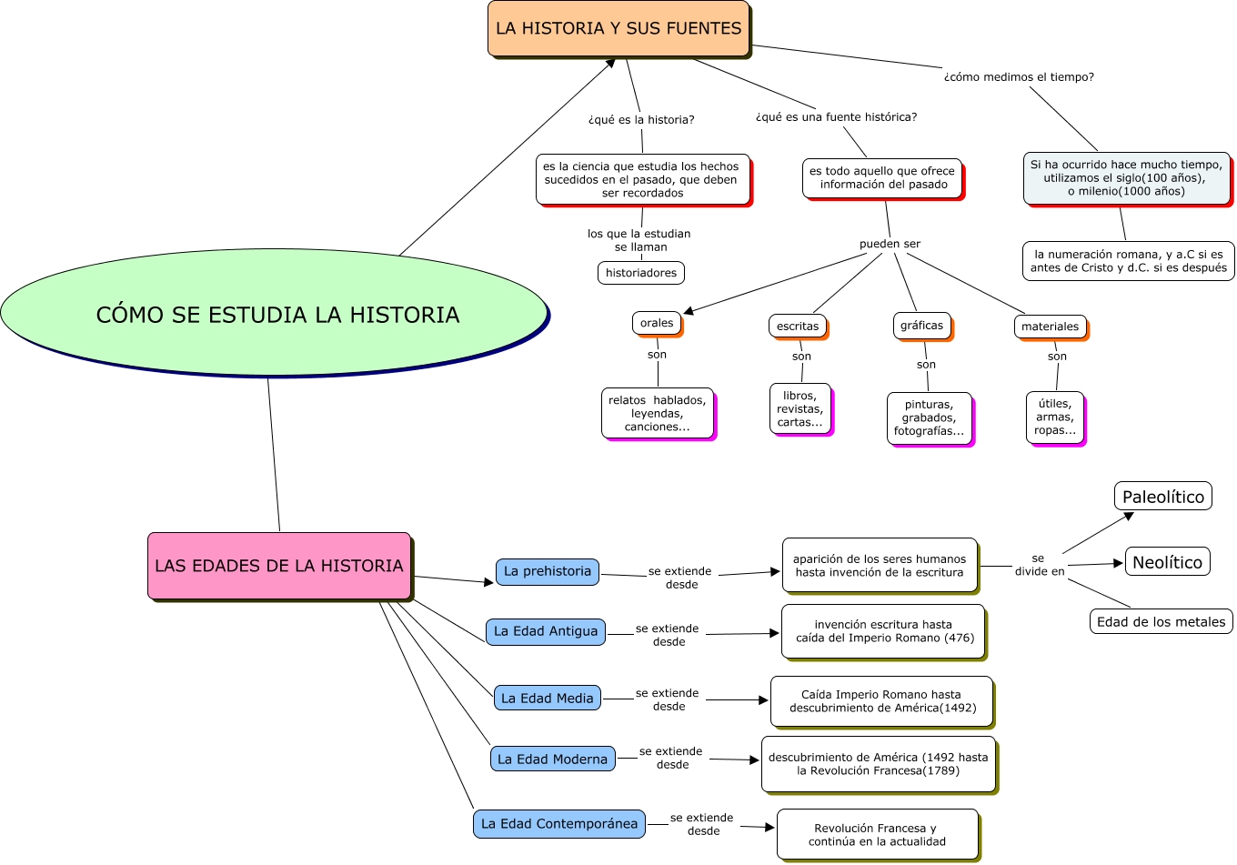 Este Cmap, tiene información relacionada con: CÓMO SE ESTUDIA LA HISTORIA, gráficas son pinturas, grabados, fotografías..., es todo aquello que ofrece información del pasado pueden ser materiales, Si ha ocurrido hace mucho tiempo, utilizamos el siglo(100 años), o milenio(1000 años) se utiliza la numeración romana, y a.C si es antes de Cristo y d.C. si es después, materiales son útiles, armas, ropas..., La Edad Media se extiende desde Caída Imperio Romano hasta descubrimiento de América(1492), escritas son libros, revistas, cartas..., aparición de los seres humanos hasta invención de la escritura se divide en Neolítico, La prehistoria se extiende desde aparición de los seres humanos hasta invención de la escritura, LA HISTORIA Y SUS FUENTES ¿cómo medimos el tiempo? Si ha ocurrido hace mucho tiempo, utilizamos el siglo(100 años), o milenio(1000 años), es todo aquello que ofrece información del pasado pueden ser escritas, es todo aquello que ofrece información del pasado pueden ser gráficas, LAS EDADES DE LA HISTORIA ???? La Edad Antigua, es todo aquello que ofrece información del pasado pueden ser orales, aparición de los seres humanos hasta invención de la escritura se divide en Paleolítico, La Edad Contemporánea se extiende desde Revolución Francesa y continúa en la actualidad, La Edad Antigua se extiende desde invención escritura hasta caída del Imperio Romano (476), LAS EDADES DE LA HISTORIA ???? La prehistoria, CÓMO SE ESTUDIA LA HISTORIA ???? LAS EDADES DE LA HISTORIA, La Edad Moderna se extiende desde descubrimiento de América (1492 hasta la Revolución Francesa(1789), aparición de los seres humanos hasta invención de la escritura se divide en Edad de los metales
