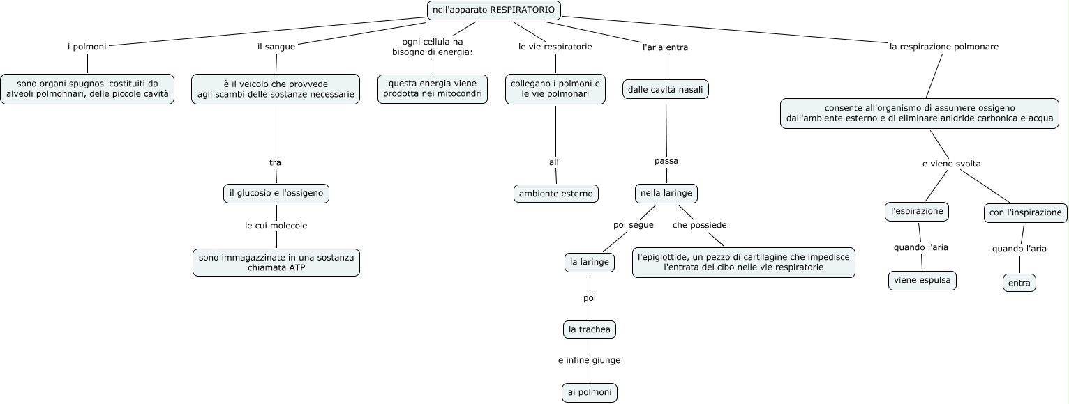 Questa Cmap, creata con IHMC CmapTools, contiene informazioni relative a: l'apparato RESPIRATORIO, collegano i polmoni e le vie polmonari all' ambiente esterno, nella laringe poi segue la laringe, l'espirazione quando l'aria viene espulsa, la laringe poi la trachea, nell'apparato RESPIRATORIO i polmoni sono organi spugnosi costituiti da alveoli polmonnari, delle piccole cavità, il glucosio e l'ossigeno le cui molecole sono immagazzinate in una sostanza chiamata ATP, nell'apparato RESPIRATORIO il sangue è il veicolo che provvede agli scambi delle sostanze necessarie, nell'apparato RESPIRATORIO le vie respiratorie collegano i polmoni e le vie polmonari, con l'inspirazione quando l'aria entra, consente all'organismo di assumere ossigeno dall'ambiente esterno e di eliminare anidride carbonica e acqua e viene svolta con l'inspirazione, consente all'organismo di assumere ossigeno dall'ambiente esterno e di eliminare anidride carbonica e acqua e viene svolta l'espirazione, la trachea e infine giunge ai polmoni, nell'apparato RESPIRATORIO la respirazione polmonare consente all'organismo di assumere ossigeno dall'ambiente esterno e di eliminare anidride carbonica e acqua, dalle cavità nasali passa nella laringe, è il veicolo che provvede agli scambi delle sostanze necessarie tra il glucosio e l'ossigeno, nell'apparato RESPIRATORIO ogni cellula ha bisogno di energia: questa energia viene prodotta nei mitocondri, nella laringe che possiede l'epiglottide, un pezzo di cartilagine che impedisce l'entrata del cibo nelle vie respiratorie, nell'apparato RESPIRATORIO l'aria entra dalle cavità nasali