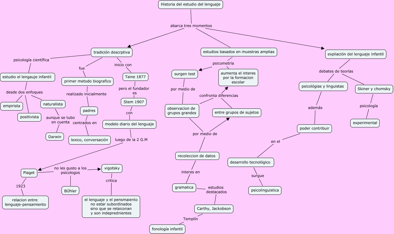 Este Cmap, tiene información relacionada con: lengujae, modelo diario del lenguaje luego de la 2 G.M Piaget, Piaget 1923 relacion entre lenguaje-pensamiento, estudios basados en muestras amplias psicometría surgen test, desarrollo tecnológico surgue psicolinguistica, tradición descrptiva psicología científica estudio el lengauje infantil, tradición descrptiva inicio con Taine 1877, estudio el lengauje infantil desde dos enfoques positivista, surgen test por medio de observacion de grupos grandes, tradición descrptiva fue primer metodo biografico, Historia del estudio del lenguaje abarca tres momentos tradición descrptiva, expliación del lenguaje infantil debates de teorías psicológias y linguistas, padres centrados en lexico, conversación, Historia del estudio del lenguaje abarca tres momentos estudios basados en muestras amplias, estudio el lengauje infantil desde dos enfoques naturalista, Taine 1877 pero el fundador es Stem 1907, Piaget no les gusto a los psicologos BÜhler, Carthy, Jackobson Templín fonología infantil, Historia del estudio del lenguaje abarca tres momentos expliación del lenguaje infantil, observacion de grupos grandes confronta diferencias aumenta el interes por la formacion escolar, psicológias y linguistas además poder contribuir