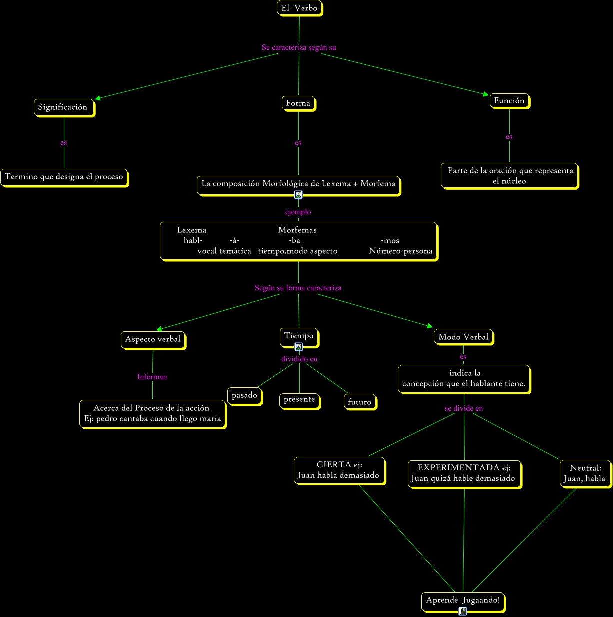 Este Cmap, tiene información relacionada con: El verbo 1, Aspecto verbal Informan Acerca del Proceso de la acción Ej: pedro cantaba cuando llego maria, La composición Morfológica de Lexema + Morfema ejemplo Lexema Morfemas habl- -á- -ba -mos vocal temática tiempo.modo aspecto Número-persona, Tiempo dividido en futuro, Lexema Morfemas habl- -á- -ba -mos vocal temática tiempo.modo aspecto Número-persona Según su forma caracteriza Modo Verbal, El Verbo Se caracteriza según su Significación, CIERTA ej: Juan habla demasiado ???? Aprende Jugaando!, indica la concepción que el hablante tiene. se divide en EXPERIMENTADA ej: Juan quizá hable demasiado, Neutral: Juan, habla ???? Aprende Jugaando!, Lexema Morfemas habl- -á- -ba -mos vocal temática tiempo.modo aspecto Número-persona Según su forma caracteriza Tiempo, Tiempo dividido en pasado, indica la concepción que el hablante tiene. se divide en CIERTA ej: Juan habla demasiado, Lexema Morfemas habl- -á- -ba -mos vocal temática tiempo.modo aspecto Número-persona Según su forma caracteriza Aspecto verbal, Significación es Termino que designa el proceso, Modo Verbal es indica la concepción que el hablante tiene., Tiempo dividido en presente, EXPERIMENTADA ej: Juan quizá hable demasiado ???? Aprende Jugaando!, Función es Parte de la oración que representa el núcleo, Forma es La composición Morfológica de Lexema + Morfema, El Verbo Se caracteriza según su Forma, El Verbo Se caracteriza según su Función