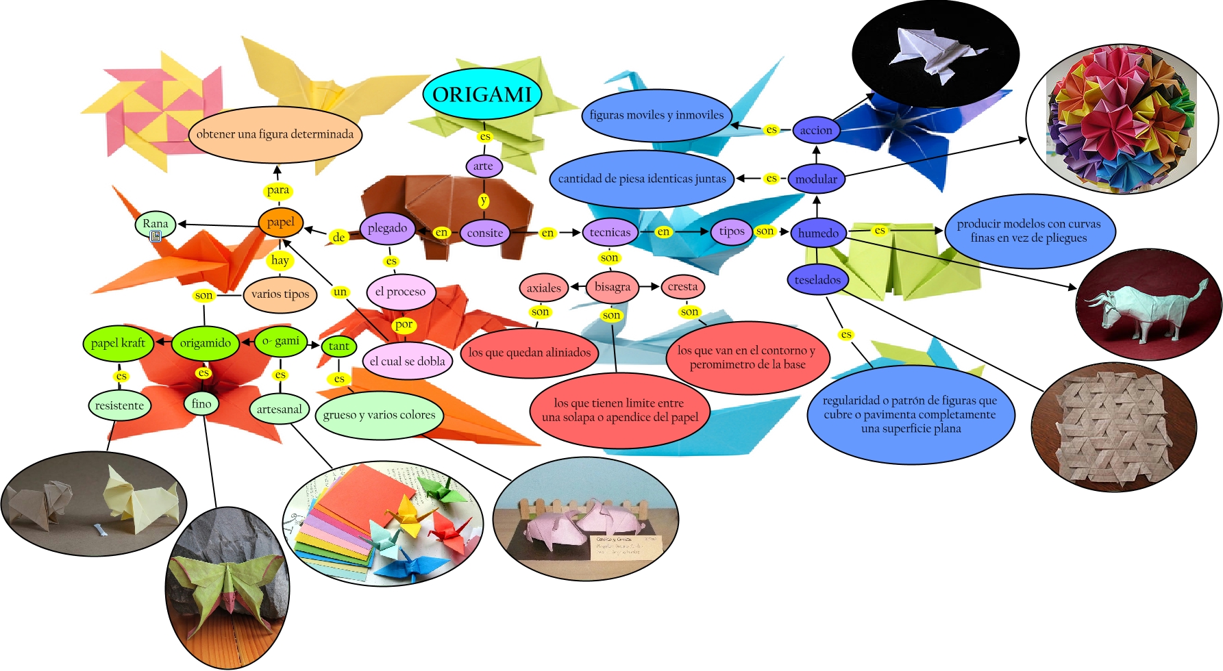 Este Cmap, tiene información relacionada con: origami, o- gami es artesanal, bisagra ???? axiales, papel hay varios tipos, papel para obtener una figura determinada, teselados es regularidad o patrón de figuras que cubre o pavimenta completamente una superficie plana, grueso y varios colores ????, bisagra son los que tienen limite entre una solapa o apendice del papel, papel ???? Rana, o- gami ???? origamido, modular ????, ORIGAMI es arte, consite en tecnicas, origamido es fino, tant es grueso y varios colores, plegado de papel, humedo ????, papel kraft ????, el cual se dobla un papel, origamido ????, consite en plegado