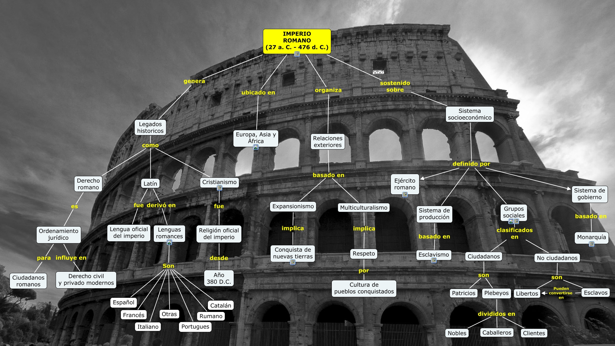 Este Cmap, tiene información relacionada con: IMPERIO ROMANO.cmap, No ciudadanos son Libertos, Religión oficial del imperio desde Año 380 D.C., Sistema socioeconómico definido por Sistema de producción, IMPERIO ROMANO (27 a. C. - 476 d. C.) ubicado en Europa, Asia y África, IMPERIO ROMANO (27 a. C. - 476 d. C.) sostenido sobre Sistema socioeconómico, Lenguas romances Son Español, Ciudadanos son Patricios, Lenguas romances Son Rumano, Ciudadanos son Plebeyos, Relaciones exteriores basado en Expansionismo, Plebeyos divididos en Caballeros, Multiculturalismo implica Respeto, IMPERIO ROMANO (27 a. C. - 476 d. C.) organiza Relaciones exteriores, Cristianismo fue Religión oficial del imperio, Lenguas romances Son Italiano, Lenguas romances Son Portugues, Lenguas romances Son Catalán, Lenguas romances Son Otras, Legados historicos como Latín, Expansionismo implica Conquista de nuevas tierras