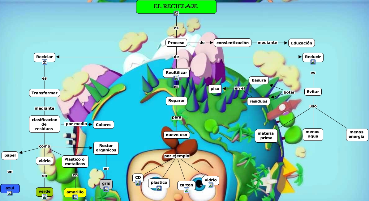 Este Cmap, tiene información relacionada con: Reciclaje, Transformar mediante clasificacion de residuos, nuevo uso por ejemplo CD, Proceso de Reducir, clasificacion de residuos como vidrio, nuevo uso por ejemplo carton, Plastico o metalicos en amarillo, clasificacion de residuos como papel, clasificacion de residuos como Plastico o metalicos, clasificacion de residuos por medio Colores, Reciclar es Transformar, Evitar uso menos energia, papel en azul, EL RECICLAJE es Proceso, nuevo uso por ejemplo plastico, vidrio en verde, Reparar para nuevo uso, Reultilizar es Reparar, Evitar uso menos agua, Proceso de consientización, Evitar botar residuos