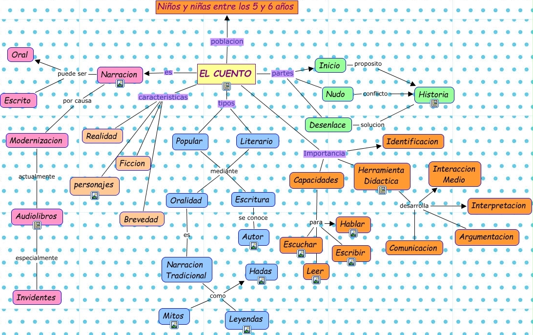 Este Cmap, tiene información relacionada con: el cuento, Oralidad es Narracion Tradicional, EL CUENTO Importancia Identificacion, Narracion puede ser Oral, Narracion por causa Modernizacion, EL CUENTO caracteristicas Ficcion, Escritura se conoce Autor, EL CUENTO poblacion Niños y niñas entre los 5 y 6 años, Modernizacion actualmente Audiolibros, Literario Escritura, Narracion Tradicional como Hadas, EL CUENTO Importancia Capacidades, Herramienta Didactica desarrolla Interpretacion, Capacidades para Escribir, Herramienta Didactica desarrolla Argumentacion, EL CUENTO es Narracion, Capacidades para Leer, Inicio proposito Historia, EL CUENTO caracteristicas Brevedad, Narracion puede ser Escrito, Desenlace solucion Historia