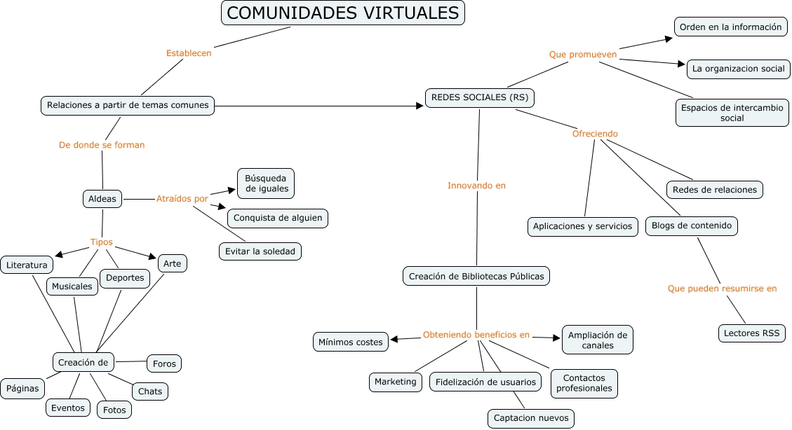 Este Cmap, tiene información relacionada con: Comunidades Virtuales Herramientas, Creación de ???? Chats, Creación de Bibliotecas Públicas Obteniendo beneficios en Ampliación de canales, REDES SOCIALES (RS) Ofreciendo Redes de relaciones, Deportes ???? Creación de, Creación de ???? Páginas, Arte ???? Creación de, Aldeas Tipos Deportes, Creación de ???? Fotos, REDES SOCIALES (RS) Innovando en Creación de Bibliotecas Públicas, Creación de Bibliotecas Públicas Obteniendo beneficios en Mínimos costes, REDES SOCIALES (RS) Que promueven La organizacion social, Aldeas Atraídos por Evitar la soledad, Literatura ???? Creación de, REDES SOCIALES (RS) Que promueven Espacios de intercambio social, Aldeas Tipos Arte, REDES SOCIALES (RS) Ofreciendo Blogs de contenido, Relaciones a partir de temas comunes ???? REDES SOCIALES (RS), Creación de ???? Foros, Creación de Bibliotecas Públicas Obteniendo beneficios en Fidelización de usuarios, REDES SOCIALES (RS) Que promueven Orden en la información
