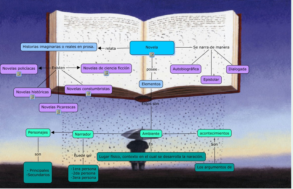 Este Cmap, tiene información relacionada con: Narrativa, Historias imaginarias o reales en prosa. Existen Novelas de ciencia ficción, Ambiente ???? acontecimientos, Narrador Puede ser -1era persona -2da persona -3era persona, Historias imaginarias o reales en prosa. Existen Novelas constumbristas, Novela relata Historias imaginarias o reales en prosa., Novela Se narra de manera Autobiográfica, Historias imaginarias o reales en prosa. Existen Novelas policíacas, Ambiente Es Lugar físico, contexto en el cual se desarrolla la naración., Historias imaginarias o reales en prosa. Existen Novelas históricas, Novela Se narra de manera Epistolar, Historias imaginarias o reales en prosa. Existen Novelas Picarescas, Novela Se narra de manera Dialogada, acontecimientos Son Los argumentos de, Personajes son - Principales -Secundarios, Novela posee Elementos, Narrador ???? Personajes, Elementos Estos son Ambiente, Ambiente ???? Narrador
