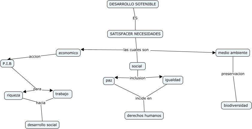 This Concept Map, created with IHMC CmapTools, has information related to: mapa numero uno, trabajo hacia desarrollo social, P.I.B para trabajo, igualdad incide en derechos humanos, DESARROLLO SOTENIBLE ES SATISFACER NECESIDADES, P.I.B para riqueza, riqueza hacia desarrollo social, SATISFACER NECESIDADES las cuales son social, paz incide en derechos humanos, medio ambiente preservacion biodiversidad, SATISFACER NECESIDADES las cuales son medio ambiente, SATISFACER NECESIDADES las cuales son economico, economico accion P.I.B, social inclusion igualdad, social inclusion paz