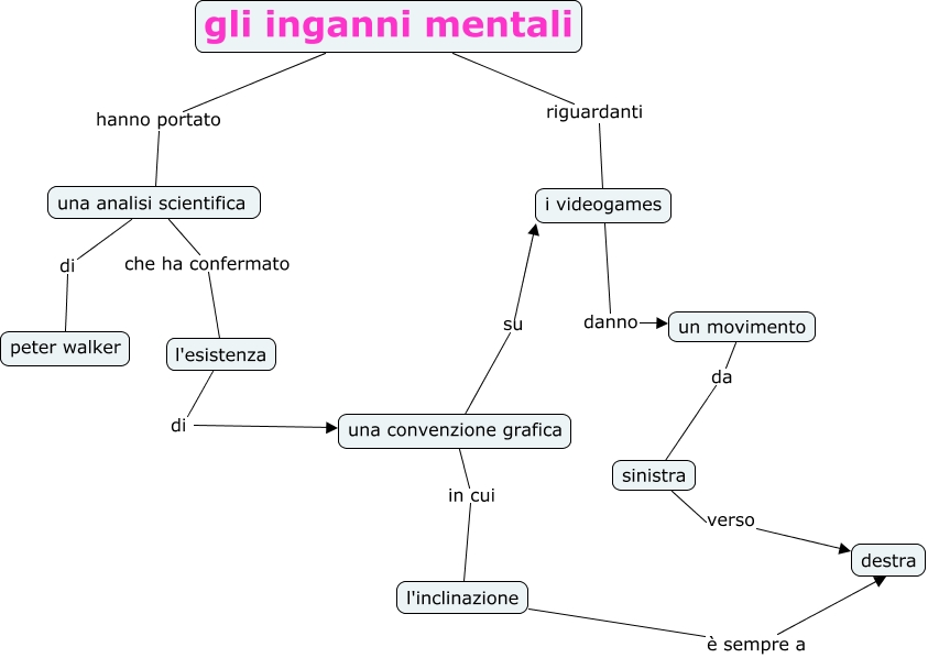 Questa Cmap, creata con IHMC CmapTools, contiene informazioni relative a: inganni mentali, una convenzione grafica su i videogames, gli inganni mentali riguardanti i videogames, gli inganni mentali hanno portato una analisi scientifica, sinistra verso destra, l'inclinazione è sempre a destra, l'esistenza di una convenzione grafica, una analisi scientifica che ha confermato l'esistenza, i videogames danno un movimento, un movimento da sinistra, una convenzione grafica in cui l'inclinazione, una analisi scientifica di peter walker
