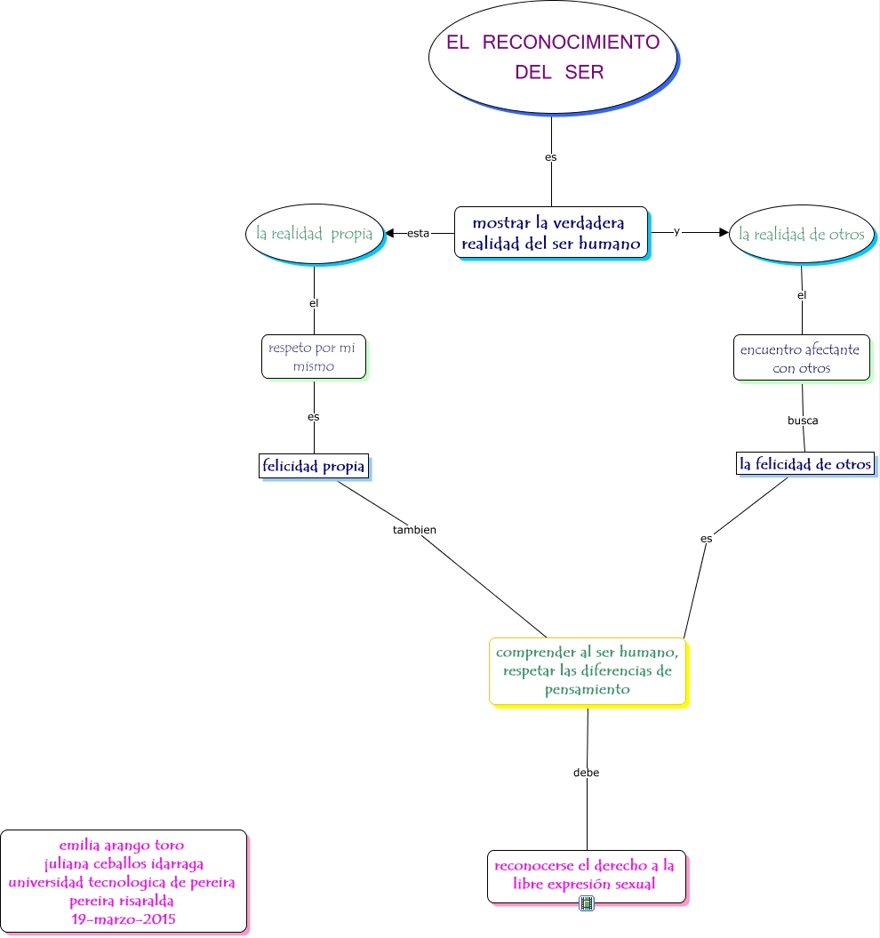Este Cmap, tiene información relacionada con: reconocimiento del ser, felicidad propia tambien comprender al ser humano, respetar las diferencias de pensamiento, encuentro afectante con otros busca la felicidad de otros, mostrar la verdadera realidad del ser humano y la realidad de otros, EL RECONOCIMIENTO DEL SER es mostrar la verdadera realidad del ser humano, mostrar la verdadera realidad del ser humano esta la realidad propia, la realidad propia el respeto por mi mismo, la felicidad de otros es comprender al ser humano, respetar las diferencias de pensamiento, la realidad de otros el encuentro afectante con otros, respeto por mi mismo es felicidad propia, comprender al ser humano, respetar las diferencias de pensamiento debe reconocerse el derecho a la libre expresión sexual