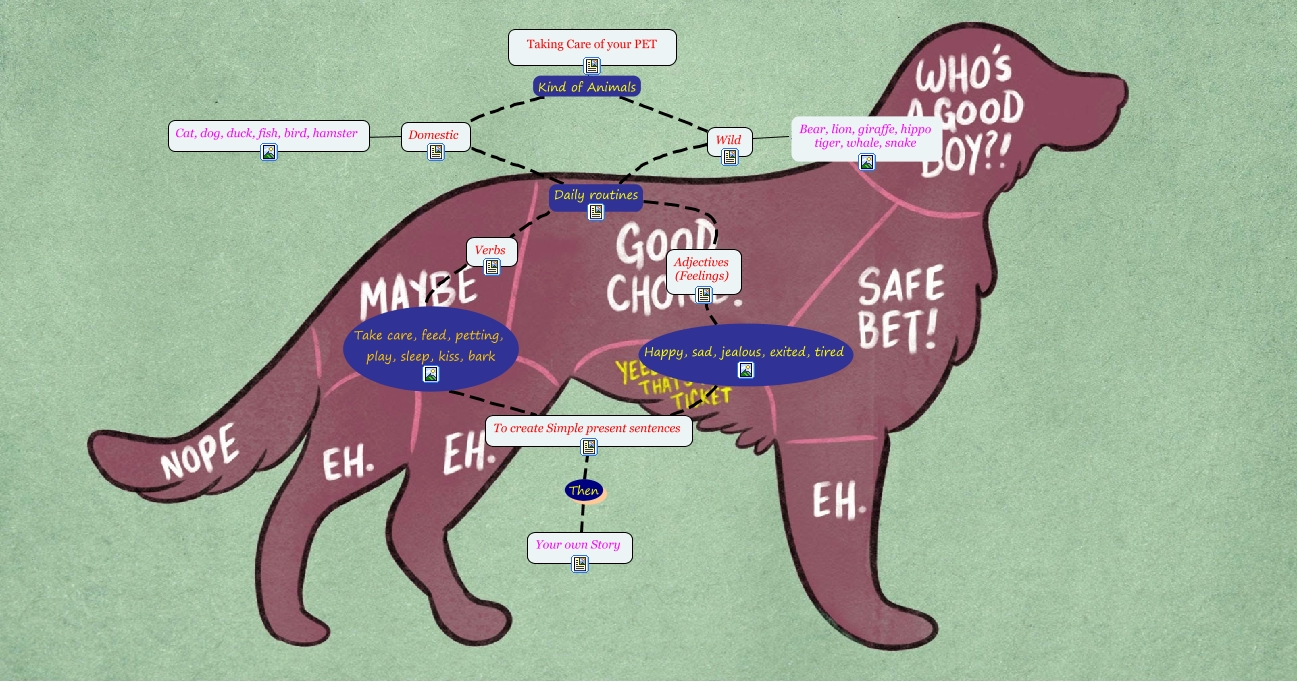 Este Cmap, tiene información relacionada con: Jenifer_Leguizamón_CMAP, Adjectives (Feelings) Happy, sad, jealous, exited, tired To create Simple present sentences, Wild ???? Bear, lion, giraffe, hippo tiger, whale, snake, Wild Daily routines Verbs, Wild Daily routines Adjectives (Feelings), Domestic Daily routines Adjectives (Feelings), Verbs Take care, feed, petting, play, sleep, kiss, bark To create Simple present sentences, Domestic Daily routines Verbs, To create Simple present sentences Then Your own Story, Taking Care of your PET Kind of Animals Domestic, Domestic ???? Cat, dog, duck, fish, bird, hamster, Taking Care of your PET Kind of Animals Wild