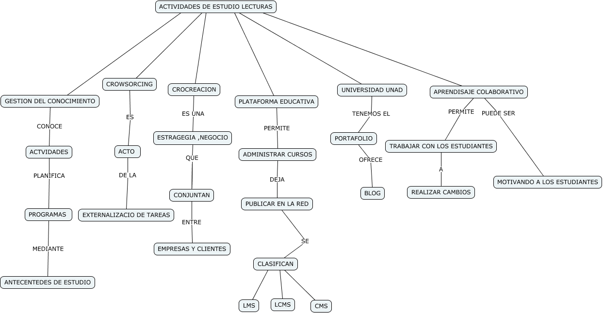 Este Cmap, tiene información relacionada con: DENIS, ESTRAGEGIA ,NEGOCIO QUE CONJUNTAN, CROWSORCING ES ACTO, PORTAFOLIO OFRECE BLOG, PROGRAMAS MEDIANTE ANTECENTEDES DE ESTUDIO, CROCREACION ES UNA ESTRAGEGIA ,NEGOCIO, CONJUNTAN ENTRE EMPRESAS Y CLIENTES, ACTO DE LA EXTERNALIZACIO DE TAREAS, APRENDISAJE COLABORATIVO PUEDE SER MOTIVANDO A LOS ESTUDIANTES, ADMINISTRAR CURSOS DEJA PUBLICAR EN LA RED, ACTIVIDADES DE ESTUDIO LECTURAS ???? UNIVERSIDAD UNAD, GESTION DEL CONOCIMIENTO CONOCE ACTVIDADES, ACTIVIDADES DE ESTUDIO LECTURAS ???? GESTION DEL CONOCIMIENTO, UNIVERSIDAD UNAD TENEMOS EL PORTAFOLIO, ACTIVIDADES DE ESTUDIO LECTURAS ???? CROWSORCING, APRENDISAJE COLABORATIVO PERMITE TRABAJAR CON LOS ESTUDIANTES, PLATAFORMA EDUCATIVA PERMITE ADMINISTRAR CURSOS, ACTVIDADES PLANIFICA PROGRAMAS, CLASIFICAN LMS LMS, ACTIVIDADES DE ESTUDIO LECTURAS ???? APRENDISAJE COLABORATIVO, ACTIVIDADES DE ESTUDIO LECTURAS ???? PLATAFORMA EDUCATIVA