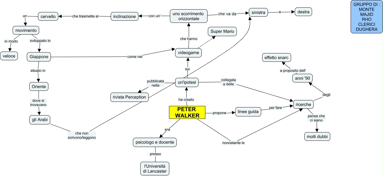 Questa Cmap, creata con IHMC CmapTools, contiene informazioni relative a: Peter Walker_v, movimento in modo veloce, videogame che hanno uno scorrimento orizzontale, videogame ???? Super Mario, PETER WALKER nonostante le ricerche, gli Arabi che non scrivono/leggono sinistra, cervello un movimento, uno scorrimento orizzontale che va da sinistra, ricerche degli anni '90, un'ipotesi collegata a delle ricerche, Giappone come nel videogame, PETER WALKER ha creato un'ipotesi, sinistra a destra, Oriente dove si trovavano gli Arabi, un'ipotesi pubblicata nella rivista Perception, linee guida per fare ricerche, uno scorrimento orizzontale con un' inclinazione, anni '90 a proposito dell' effetto snarc, PETER WALKER propone linee guida, psicologo e docente presso l'Università di Lancaster, Giappone situato in Oriente