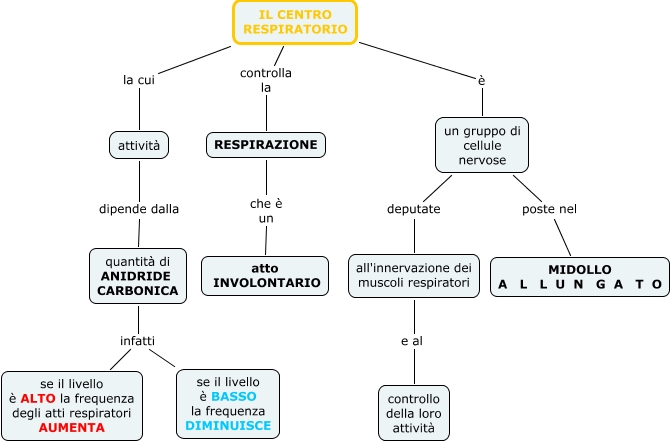 Questa Cmap, creata con IHMC CmapTools, contiene informazioni relative a: CENTRO RESPIRATORIO, un gruppo di cellule nervose poste nel MIDOLLO A L L U N G A T O, un gruppo di cellule nervose deputate all'innervazione dei muscoli respiratori, RESPIRAZIONE che è un atto INVOLONTARIO, attività dipende dalla quantità di ANIDRIDE CARBONICA, IL CENTRO RESPIRATORIO è un gruppo di cellule nervose, quantità di ANIDRIDE CARBONICA infatti se il livello è ALTO la frequenza degli atti respiratori AUMENTA, IL CENTRO RESPIRATORIO la cui attività, all'innervazione dei muscoli respiratori e al controllo della loro attività, IL CENTRO RESPIRATORIO controlla la RESPIRAZIONE, quantità di ANIDRIDE CARBONICA infatti se il livello è BASSO la frequenza DIMINUISCE