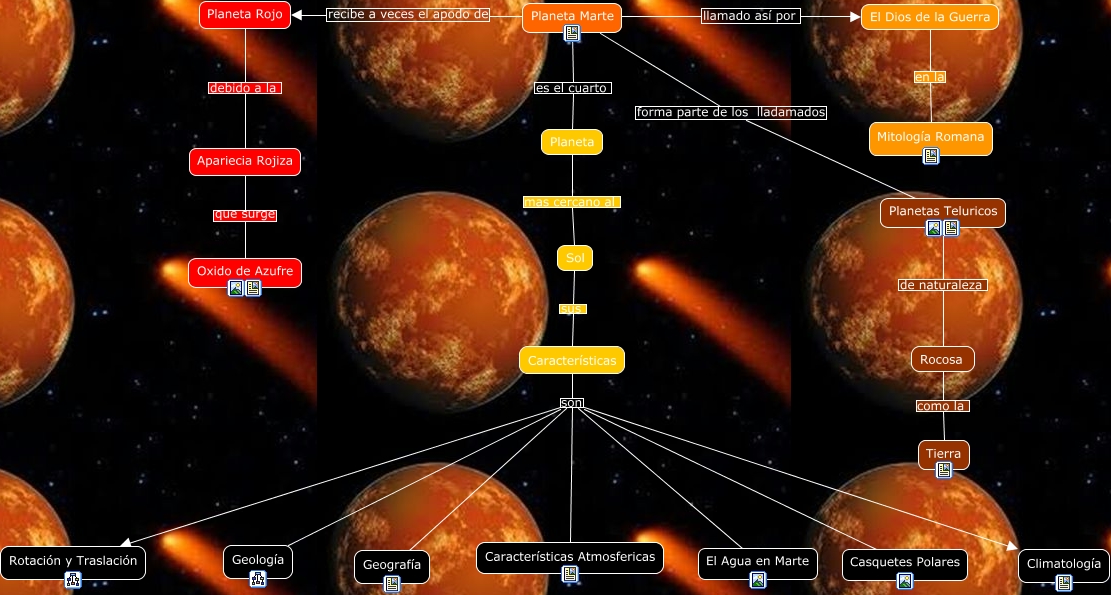 Este Cmap, tiene información relacionada con: Mapa Coceptual, Características son Casquetes Polares, Características son Rotación y Traslación, Características son Geología, Apariecia Rojiza que surge Oxido de Azufre, Planeta Marte es el cuarto Planeta, Características son Climatología, Planeta Rojo debido a la Apariecia Rojiza, Características son El Agua en Marte, Planeta mas cercano al Sol, Planeta Marte forma parte de los lladamados Planetas Teluricos, Planetas Teluricos de naturaleza Rocosa, Características son Características Atmosfericas, Planeta Marte recibe a veces el apodo de Planeta Rojo, Características son Geografía, Planeta Marte llamado así por El Dios de la Guerra, Sol sus Características, El Dios de la Guerra en la Mitología Romana, Rocosa como la Tierra