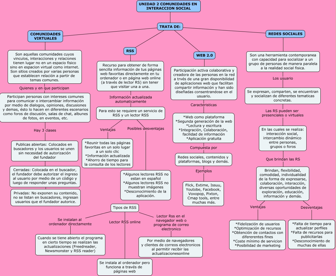 Este Cmap, tiene información relacionada con: UNIDAD 2 Comunidades en interacción social, Tipos de RSS Lector RSS online Se instala al ordenador pero funciona a través de páginas web, TRATA DE: ???? COMUNIDADES VIRTUALES, Son una herramienta contemporanea con capacidad para socializar a un grupo de personas de manera paralela a la realidad social fisica. Los usuario Se expresan, comparten, se encuentran y socializan de diferentes tematicas concretas., Para esto se requiere un servicio de RSS y un lector RSS Ventajas *Reunir todas las páginas favoritas en un solo lugar a un solo clic *Información actualizada *Ahorro de tiempo para la consulta de los lectores, *Web como plataforma *Segunda generación de la web *Lectura y escritura *Integración, Colaboración, facilidad de información *Aplicación gratuita Compuesta por Redes sociales, contenidos y plataformas, blogs y demás., Para esto se requiere un servicio de RSS y un lector RSS Posibles desventajas *Algunos lectores RSS no estan en español *Algunos lectores RSS no muestran imágenes *Desconocimiento de la aplicación., REDES SOCIALES ???? Son una herramienta contemporanea con capacidad para socializar a un grupo de personas de manera paralela a la realidad social fisica., Redes sociales, contenidos y plataformas, blogs y demás. Ejemplos Flick, Extime, Issuu, Youtobe, Facebook, Voxopop, Pixton, Cmap tools, entre muchas más., Se expresan, comparten, se encuentran y socializan de diferentes tematicas concretas. Las RS pueden ser presenciales o virtuales En las cuales se realiza: interacción social, intercambio dinámico entre personas, grupos o foros, Recurso para obtener de forma sencilla información de tus páginas web favoritas directamente en tu ordenador o en página web online (a través de lector RS) sin tener que visitar una a una. Información actualizada automaticamente Para esto se requiere un servicio de RSS y un lector RSS, TRATA DE: ???? UNIDAD 2 COMUNIDADES EN INTERACCION SOCIAL, Son aquellas comunidades cuyos vinculos, interacciones y relaciones tienen lugar no en un espacio fisico sino en espacion virtual como internet. Son sitios creados por varias personas que establecen relación a partir de temas comunes. Quienes y en que participan Participan personas con intereses comunes para comunicar o intercambiar información por medio de dialogos, opiniones, discusiones y demas, ésto lo hacen en diferentes escenarios como foros de discusión, salas de chat, albunes de fotos, en eventos, etc., RSS ???? Recurso para obtener de forma sencilla información de tus páginas web favoritas directamente en tu ordenador o en página web online (a través de lector RS) sin tener que visitar una a una., Cerradas: Colocada en el buscador, el fundador debe autorizar el ingreso al usuario por medio de un código y luego de responder unas preguntas. ???? Privadas: No exponen su contenido, no se listan en buscadores, ingresan usuarios que el fundador autorice., En las cuales se realiza: interacción social, intercambio dinámico entre personas, grupos o foros Que brindan las RS Brindan, flexibilidad, comodidad, individualidad de la forma de expresarse, colaboración, interacción, diversas oportunidades de exploración, educación, información y demás., TRATA DE: ???? REDES SOCIALES, Participación activa colaborativa y creadora de las personas en la red a trvés de una gran disponibilidad de aplicaciones web que facilitan compartir información y han sido diseñadas consentrandose en el usuario. Caracteristicas *Web como plataforma *Segunda generación de la web *Lectura y escritura *Integración, Colaboración, facilidad de información *Aplicación gratuita, Publicas abiertas: Colocados en buscadores y los usuarios se unen sin necesidad de autorización del fundador ???? Cerradas: Colocada en el buscador, el fundador debe autorizar el ingreso al usuario por medio de un código y luego de responder unas preguntas., Tipos de RSS Se instalan al ordenador directamente Cuando se tiene abierto el programa en cierto tiempo se realizan las actualizaciones (Freedreader, Newsmonster y RSS reader), Brindan, flexibilidad, comodidad, individualidad de la forma de expresarse, colaboración, interacción, diversas oportunidades de exploración, educación, información y demás. Ventajas *Fidelización de usuarios *Optimización de recursos *Obtención de contactos con difererentes fines *Coste mínimo de servicion *Posibilidad de marketing