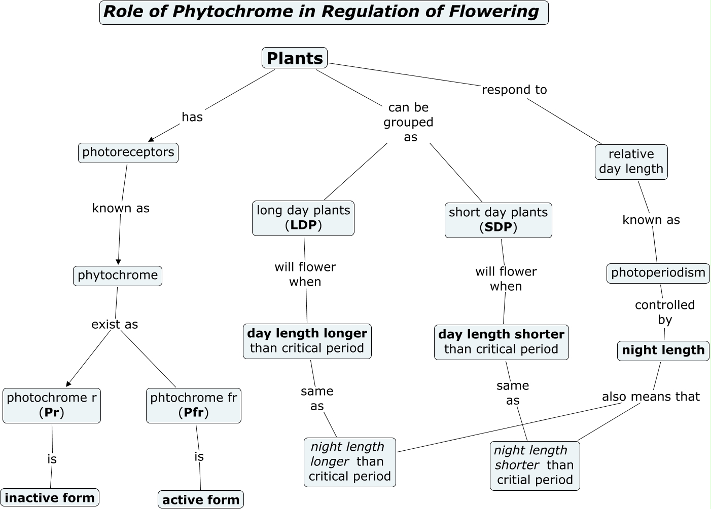 This Concept Map, created with IHMC CmapTools, has information related to: Plants, short day plants (SDP) will flower when day length shorter than critical period, night length also means that night length shorter than critial period, long day plants (LDP) will flower when day length longer than critical period, Plants respond to relative day length, night length also means that night length longer than critical period, relative day length known as photoperiodism, phytochrome exist as photochrome r (Pr), phtochrome fr (Pfr) is active form, photoperiodism controlled by night length, phytochrome exist as phtochrome fr (Pfr), Plants can be grouped as short day plants (SDP), night length longer than critical period same as day length longer than critical period, photoreceptors known as phytochrome, photochrome r (Pr) is inactive form, night length shorter than critial period same as day length shorter than critical period, Plants has photoreceptors, Plants can be grouped as long day plants (LDP)
