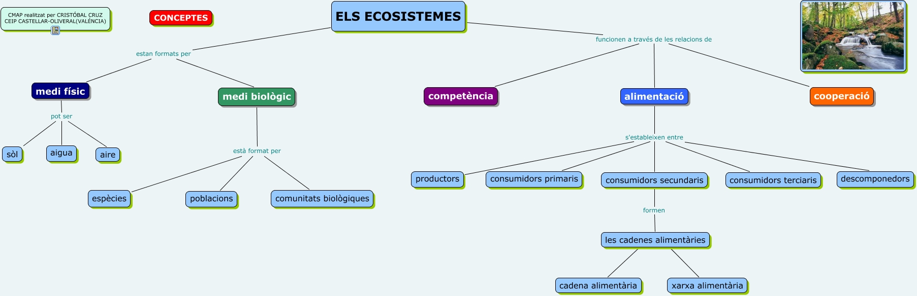 Este Cmap, tiene información relacionada con: ELS ECOSISTEMES, consumidors secundaris formen les cadenes alimentàries, alimentació funcionen a través de les relacions de competència, medi biològic està format per poblacions, ELS ECOSISTEMES funcionen a través de les relacions de competència, les cadenes alimentàries ???? cadena alimentària, consumidors primaris s'estableixen entre consumidors secundaris, consumidors primaris s'estableixen entre productors, consumidors primaris s'estableixen entre descomponedors, medi físic pot ser sòl, ELS ECOSISTEMES estan formats per medi biològic, medi físic pot ser aire, medi físic pot ser aigua, cooperació funcionen a través de les relacions de competència, medi biològic està format per espècies, les cadenes alimentàries ???? xarxa alimentària, consumidors primaris s'estableixen entre consumidors terciaris, medi biològic està format per comunitats biològiques, consumidors primaris s'estableixen entre alimentació, ELS ECOSISTEMES estan formats per medi físic