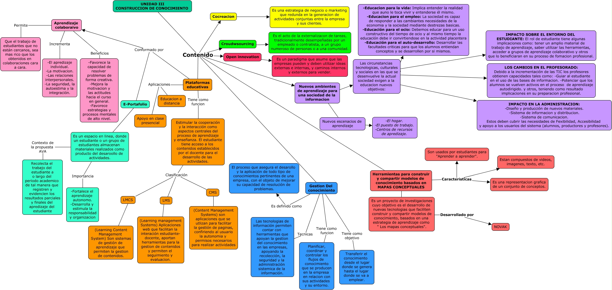 Este Cmap, tiene información relacionada con: CONSTRUCCION DE CONOCIMIENTO, Gestion Del conocimiento Es definido como El proceso que asegura el desarollo y la aplicación de todo tipo de conocimientos pertinentes de una empresa, con el objeto de mejorar su capacidad de resolución de problemas., Plataformas educativas Tiene como funcion Estimular la cooperación y la interacción como aspectos centrales del proceso de aprendizaje y enseñanza. El estudiante tiene acceso a los contenidos establecidos por el docente para el desarrollo de las actividades., E-Portafolio ???? Es un espacio en linea, donde un estudiante o un grupo de estudiantes almacenan materiales realizados como producto del desaroollo de actividades., UNIDAD III CONSTRUCCION DE CONOCIMIENTO Contenido Open innovation, UNIDAD III CONSTRUCCION DE CONOCIMIENTO Contenido Plataformas educativas, Aprendizaje colaboraivo Beneficios -Favorece la capacidad de resolver problemas de forma creativa. -Mejora la motivacion y las actitudes hacia el curso en general. -Favorece estrategias y procesos mentales de alto nivel., Estimular la cooperación y la interacción como aspectos centrales del proceso de aprendizaje y enseñanza. El estudiante tiene acceso a los contenidos establecidos por el docente para el desarrollo de las actividades. Clasificación LMCS, UNIDAD III CONSTRUCCION DE CONOCIMIENTO Contenido Cocreacion, Estimular la cooperación y la interacción como aspectos centrales del proceso de aprendizaje y enseñanza. El estudiante tiene acceso a los contenidos establecidos por el docente para el desarrollo de las actividades. Clasificación CMS, Es un espacio en linea, donde un estudiante o un grupo de estudiantes almacenan materiales realizados como producto del desaroollo de actividades. Importancia -Fortalece el aprendizaje autonomo. -Desarrolla y estimula la responsabilidad y organizacion, Plataformas educativas Conformado por Aprendizaje colaboraivo, UNIDAD III CONSTRUCCION DE CONOCIMIENTO Contenido Nuevos ambientes de aprendizaje para una sociedad de la informacion, CMS ???? (Content Management Systems) son aplicaciones que se utlizan para facilitar la gestión de paginas, confiriendo al usuario la autonomia y permisos necesarios para realizar actividades, Nuevos ambientes de aprendizaje para una sociedad de la informacion ???? Las circunstancias tecnologicas, culturales y sociales en las que se desenvuelve la actual sociedad exigen a la educacion nuevos objetivos:, Cocreacion ???? Es una estrategia de negocio o marketing que redunda en la generacion de actividades conjuntas entre la empresa y sus clientes., LMS ???? (Learning management Systems) Aplicaciones web que facilitan la interación estudiante- docente, aportan herramientas para la gestion de contenidos y permiten el seguimiento y evaluacion., Nuevos escenacios de aprendizaje ???? -El hogar. -El puesto de trabajo. -Centros de recursos de apredizaje., UNIDAD III CONSTRUCCION DE CONOCIMIENTO Contenido Herramientas para construir y compartir modelos de conocimiento basados en MAPAS CONCEPTUALES, UNIDAD III CONSTRUCCION DE CONOCIMIENTO Contenido Gestion Del conocimiento, Herramientas para construir y compartir modelos de conocimiento basados en MAPAS CONCEPTUALES ???? Es un proyecto de investigaciones cuyo objetivo es el desarrollo de nuevas tecnologias que faciliten construir y compartir modelos de conocimiento, basados en una estrategia de aprendizaje como " Los mapas conceptuales".