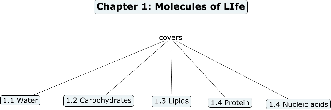 This Concept Map, created with IHMC CmapTools, has information related to: Chapter 1_Molecules of Life syllabus, Chapter 1: Molecules of LIfe covers 1.4 Protein, Chapter 1: Molecules of LIfe covers 1.2 Carbohydrates, Chapter 1: Molecules of LIfe covers 1.3 Lipids, Chapter 1: Molecules of LIfe covers 1.1 Water, Chapter 1: Molecules of LIfe covers 1.4 Nucleic acids