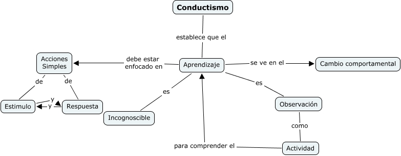 Este Cmap, tiene información relacionada con: Conductismo, Conductismo establece que el Aprendizaje, Aprendizaje se ve en el Cambio comportamental, Acciones Simples de Estimulo, Aprendizaje es Observación, Aprendizaje debe estar enfocado en Acciones Simples, Actividad para comprender el Aprendizaje, Respuesta y Estimulo, Estimulo y Respuesta, Observación como Actividad, Aprendizaje es Incognoscible, Acciones Simples de Respuesta