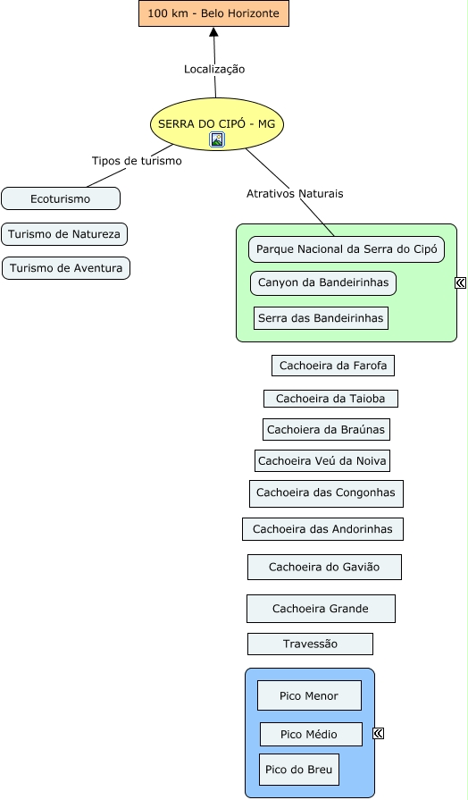 Esse mapa conceitual, produzido no IHMC CmapTools, tem a informação relacionada a: Turismo tipologias, SERRA DO CIPÓ - MG Tipos de turismo Ecoturismo, SERRA DO CIPÓ - MG Localização 100 km - Belo Horizonte, SERRA DO CIPÓ - MG Atrativos Naturais Parque Nacional da Serra do Cipó