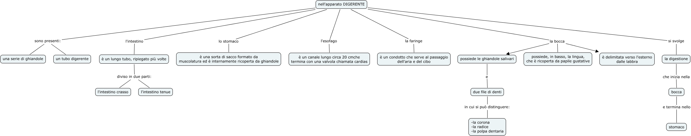 Questa Cmap, creata con IHMC CmapTools, contiene informazioni relative a: l'apparato digerente, nell'apparato DIGERENTE l'esofago è un canale lungo circa 20 cmche termina con una valvola chiamata cardias, nell'apparato DIGERENTE la bocca possiede le ghiandole salivari, è un lungo tubo, ripiegato più volte diviso in due parti: l'intestino crasso, nell'apparato DIGERENTE lo stomaco è una sorta di sacco formato da muscolatura ed è internamente ricoperta da ghiandole, due file di denti in cui si può distinguere: -la corona -la radice -la polpa dentaria, la digestione che inizia nella bocca, nell'apparato DIGERENTE si svolge la digestione, nell'apparato DIGERENTE la faringe è un condotto che serve al passaggio dell'aria e del cibo, possiede le ghiandole salivari e due file di denti, bocca e termina nello stomaco, nell'apparato DIGERENTE sono presenti: una serie di ghiandole, nell'apparato DIGERENTE la bocca è delimitata verso l'esterno dalle labbra, nell'apparato DIGERENTE la bocca possiede, in basso, la lingua, che è ricoperta da papile gustative, nell'apparato DIGERENTE l'intestino è un lungo tubo, ripiegato più volte, è un lungo tubo, ripiegato più volte diviso in due parti: l'intestino tenue, nell'apparato DIGERENTE sono presenti: un tubo digerente
