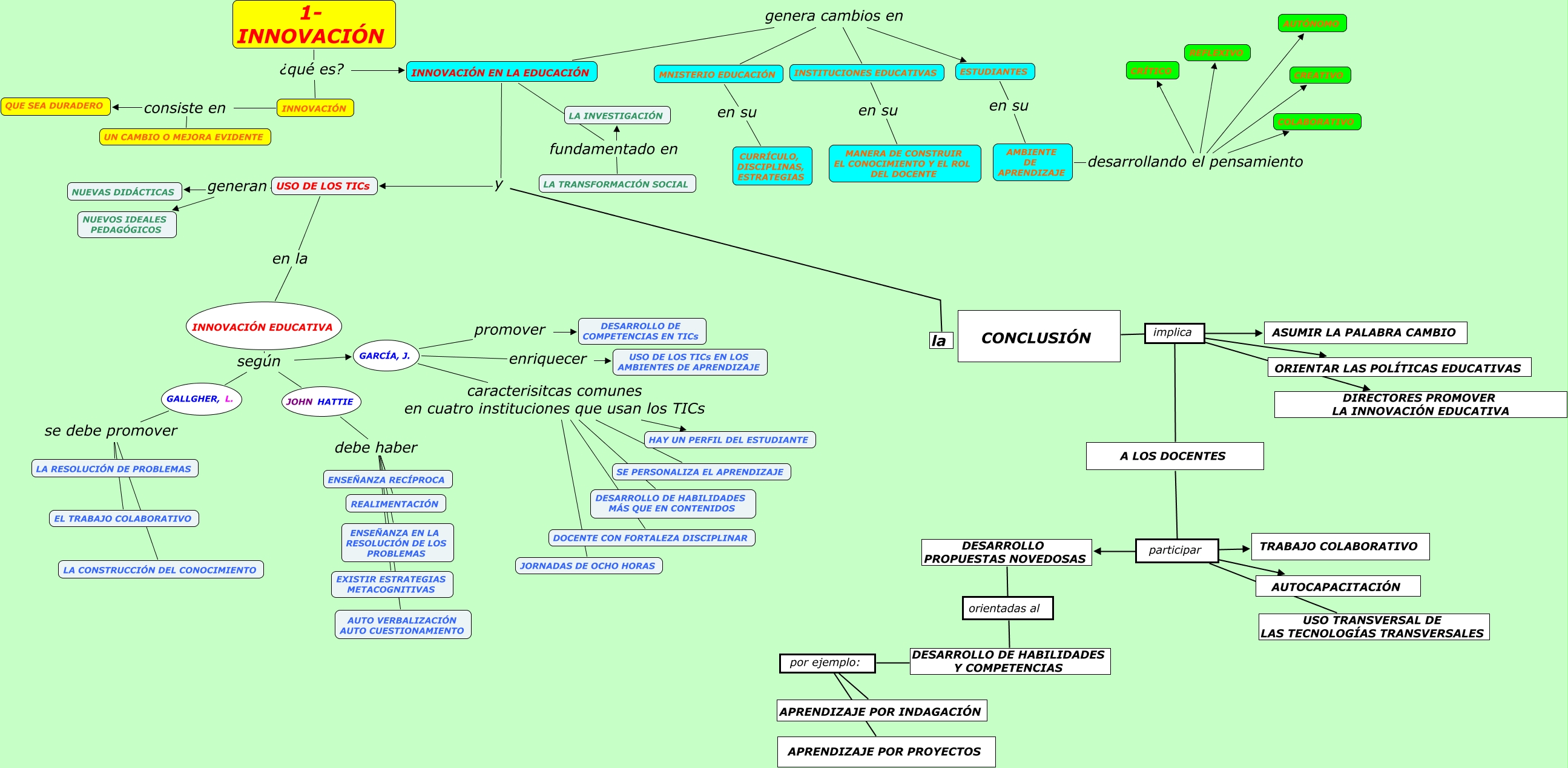 Este Cmap, tiene información relacionada con: INNOVACIÓN, JOHN HATTIE debe haber AUTO VERBALIZACIÓN AUTO CUESTIONAMIENTO, INNOVACIÓN EN LA EDUCACIÓN fundamentado en LA TRANSFORMACIÓN SOCIAL, GARCÍA, J. caracterisitcas comunes en cuatro instituciones que usan los TICs DOCENTE CON FORTALEZA DISCIPLINAR, GARCÍA, J. caracterisitcas comunes en cuatro instituciones que usan los TICs DESARROLLO DE HABILIDADES MÁS QUE EN CONTENIDOS, JOHN HATTIE debe haber REALIMENTACIÓN, GARCÍA, J. promover DESARROLLO DE COMPETENCIAS EN TICs, 1- INNOVACIÓN ¿qué es? INNOVACIÓN, GARCÍA, J. caracterisitcas comunes en cuatro instituciones que usan los TICs HAY UN PERFIL DEL ESTUDIANTE, INNOVACIÓN consiste en QUE SEA DURADERO, INNOVACIÓN EN LA EDUCACIÓN genera cambios en ESTUDIANTES, CONCLUSIÓN implica DIRECTORES PROMOVER LA INNOVACIÓN EDUCATIVA, CONCLUSIÓN implica ASUMIR LA PALABRA CAMBIO, AMBIENTE DE APRENDIZAJE desarrollando el pensamiento AUTÓNOMO, INNOVACIÓN EN LA EDUCACIÓN genera cambios en MNISTERIO EDUCACIÓN, A LOS DOCENTES participar DESARROLLO PROPUESTAS NOVEDOSAS, INNOVACIÓN EN LA EDUCACIÓN fundamentado en LA INVESTIGACIÓN, AMBIENTE DE APRENDIZAJE desarrollando el pensamiento COLABORATIVO, JOHN HATTIE debe haber EXISTIR ESTRATEGIAS METACOGNITIVAS, DESARROLLO DE HABILIDADES Y COMPETENCIAS por ejemplo: APRENDIZAJE POR INDAGACIÓN, INNOVACIÓN EN LA EDUCACIÓN genera cambios en INSTITUCIONES EDUCATIVAS