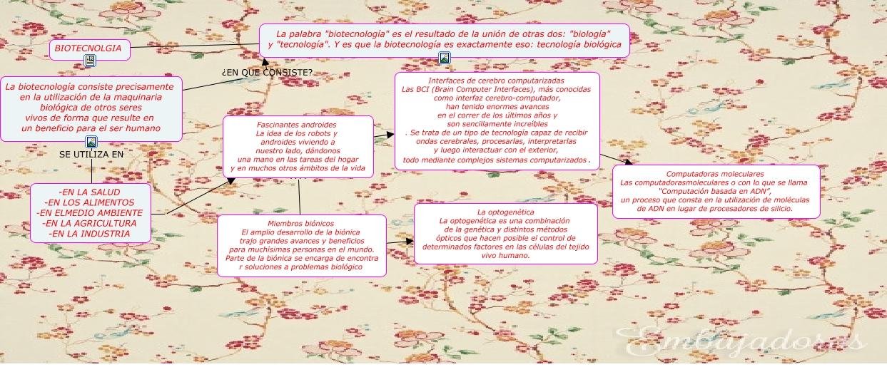 Este Cmap, tiene información relacionada con: biotecnologia, BIOTECNOLGIA ???? La palabra "biotecnología" es el resultado de la unión de otras dos: "biología" y "tecnología". Y es que la biotecnología es exactamente eso: tecnología biológica, Fascinantes androides La idea de los robots y androides viviendo a nuestro lado, dándonos una mano en las tareas del hogar y en muchos otros ámbitos de la vida ???? Miembros biónicos El amplio desarrollo de la biónica trajo grandes avances y beneficios para muchísimas personas en el mundo. Parte de la biónica se encarga de encontra r soluciones a problemas biológico, La biotecnología consiste precisamente en la utilización de la maquinaria biológica de otros seres vivos de forma que resulte en un beneficio para el ser humano ¿EN QUE CONSISTE? La palabra "biotecnología" es el resultado de la unión de otras dos: "biología" y "tecnología". Y es que la biotecnología es exactamente eso: tecnología biológica, Fascinantes androides La idea de los robots y androides viviendo a nuestro lado, dándonos una mano en las tareas del hogar y en muchos otros ámbitos de la vida ???? Interfaces de cerebro computarizadas Las BCI (Brain Computer Interfaces), más conocidas como interfaz cerebro-computador, han tenido enormes avances en el correr de los últimos años y son sencillamente increíbles . Se trata de un tipo de tecnología capaz de recibir ondas cerebrales, procesarlas, interpretarlas y luego interactuar con el exterior, todo mediante complejos sistemas computarizados., Miembros biónicos El amplio desarrollo de la biónica trajo grandes avances y beneficios para muchísimas personas en el mundo. Parte de la biónica se encarga de encontra r soluciones a problemas biológico ???? La optogenética La optogenética es una combinación de la genética y distintos métodos ópticos que hacen posible el control de determinados factores en las células del tejido vivo humano., -EN LA SALUD -EN LOS ALIMENTOS -EN ELMEDIO AMBIENTE -EN LA AGRICULTURA -EN LA INDUSTRIA Fascinantes androides La idea de los robots y androides viviendo a nuestro lado, dándonos una mano en las tareas del hogar y en muchos otros ámbitos de la vida, Interfaces de cerebro computarizadas Las BCI (Brain Computer Interfaces), más conocidas como interfaz cerebro-computador, han tenido enormes avances en el correr de los últimos años y son sencillamente increíbles . Se trata de un tipo de tecnología capaz de recibir ondas cerebrales, procesarlas, interpretarlas y luego interactuar con el exterior, todo mediante complejos sistemas computarizados. ???? Computadoras moleculares Las computadorasmoleculares o con lo que se llama “Computación basada en ADN”, un proceso que consta en la utilización de moléculas de ADN en lugar de procesadores de silicio., BIOTECNOLGIA La biotecnología consiste precisamente en la utilización de la maquinaria biológica de otros seres vivos de forma que resulte en un beneficio para el ser humano, La biotecnología consiste precisamente en la utilización de la maquinaria biológica de otros seres vivos de forma que resulte en un beneficio para el ser humano SE UTILIZA EN -EN LA SALUD -EN LOS ALIMENTOS -EN ELMEDIO AMBIENTE -EN LA AGRICULTURA -EN LA INDUSTRIA