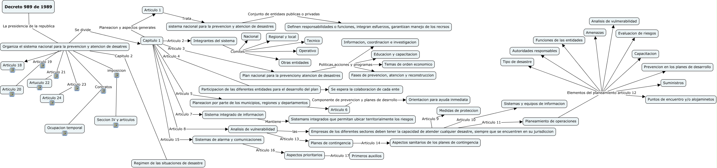 Este Cmap, tiene información relacionada con: Decreto 989 de 1989, Planeamiento de operaciones Elementos del planeamiento articulo 12 Tipo de desastre, Planeamiento de operaciones Elementos del planeamiento articulo 12 Analisis de vulmerabilidad, Planeamiento de operaciones Elementos del planeamiento articulo 12 Prevencion en los planes de desarrollo, Planeamiento de operaciones Elementos del planeamiento articulo 12 Capacitacion, Planeamiento de operaciones Elementos del planeamiento articulo 12 Amenazas, Integrantes del sistema Comites Otras entidades, Planes de contingencia Articulo 14 Aspectos sanitarios de los planes de contingencia, Capitulo 1 Articulo 7 Sistema integrado de informacion, Plan nacional para la prevenciony atencion de desastres Politicas,acciones y programas Temas de orden economico, Organiza el sistema nacional para la prevencion y atencion de desatres ???? Articulo 18, Aspectos prioritarios Articulo 17 Primeros auxilios, Integrantes del sistema Comites Regional y local, Analisis de vulnerabilidad las Empresas de los diferentes sectores deben tener la capacidad de atender cualquier desastre, siempre que se encuentren en su jurisdiccion, Planeamiento de operaciones Elementos del planeamiento articulo 12 Funciones de las entidades, Integrantes del sistema Comites Operativo, Capitulo 1 Articulo 15 Sistemas de alarma y comunicaciones, Sistemas de alarma y comunicaciones Articulo 16 Aspectos prioritarios, Capitulo 1 Articulo 5 Planeacion por parte de los municipios, regiones y departamentos, Organiza el sistema nacional para la prevencion y atencion de desatres Articulo 23 Articulo 24, Capitulo 1 Articulo 4 Participacion de las diferentes entidades para el desarrollo del plan