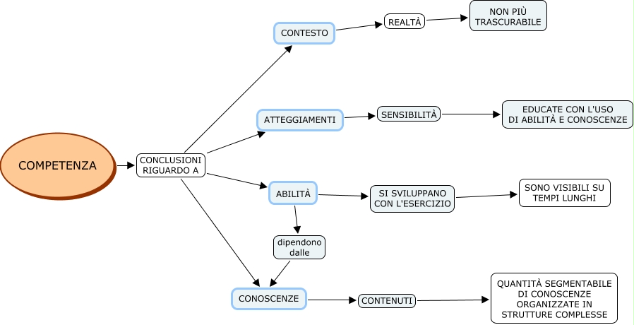 Questa Cmap, creata con IHMC CmapTools, contiene informazioni relative a: conseguenze educative, ABILITÀ dipendono dalle CONOSCENZE, COMPETENZA CONCLUSIONI RIGUARDO A ATTEGGIAMENTI, ATTEGGIAMENTI SENSIBILITÀ EDUCATE CON L'USO DI ABILITÀ E CONOSCENZE, COMPETENZA CONCLUSIONI RIGUARDO A CONOSCENZE, ABILITÀ SI SVILUPPANO CON L'ESERCIZIO SONO VISIBILI SU TEMPI LUNGHI, COMPETENZA CONCLUSIONI RIGUARDO A CONTESTO, COMPETENZA CONCLUSIONI RIGUARDO A ABILITÀ, CONTESTO REALTÀ NON PIÙ TRASCURABILE, CONOSCENZE CONTENUTI QUANTITÀ SEGMENTABILE DI CONOSCENZE ORGANIZZATE IN STRUTTURE COMPLESSE