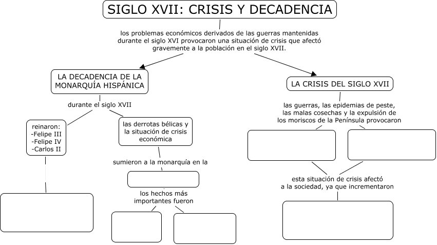 Este Cmap, tiene información relacionada con: Siglo XVII, los hechos más importantes fueron, reinaron: -Felipe III -Felipe IV -Carlos II, LA CRISIS DEL SIGLO XVII las guerras, las epidemias de peste, las malas cosechas y la expulsión de los moriscos de la Península provocaron, esta situación de crisis afectó a la sociedad, ya que incrementaron, esta situación de crisis afectó a la sociedad, ya que incrementaron, SIGLO XVII: CRISIS Y DECADENCIA los problemas económicos derivados de las guerras mantenidas durante el siglo XVI provocaron una situación de crisis que afectó gravemente a la población en el siglo XVII. LA DECADENCIA DE LA MONARQUÍA HISPÁNICA, SIGLO XVII: CRISIS Y DECADENCIA los problemas económicos derivados de las guerras mantenidas durante el siglo XVI provocaron una situación de crisis que afectó gravemente a la población en el siglo XVII. LA CRISIS DEL SIGLO XVII, los hechos más importantes fueron, LA DECADENCIA DE LA MONARQUÍA HISPÁNICA durante el siglo XVII reinaron: -Felipe III -Felipe IV -Carlos II, LA DECADENCIA DE LA MONARQUÍA HISPÁNICA durante el siglo XVII las derrotas bélicas y la situación de crisis económica, LA CRISIS DEL SIGLO XVII las guerras, las epidemias de peste, las malas cosechas y la expulsión de los moriscos de la Península provocaron, las derrotas bélicas y la situación de crisis económica sumieron a la monarquía en la