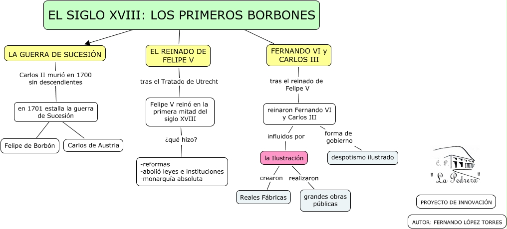 Este Cmap, tiene información relacionada con: Siglo XVIII los Borbones, EL REINADO DE FELIPE V tras el Tratado de Utrecht Felipe V reinó en la primera mitad del siglo XVIII, la Ilustración realizaron grandes obras públicas, en 1701 estalla la guerra de Sucesión ???? Carlos de Austria, reinaron Fernando VI y Carlos III influidos por la Ilustración, en 1701 estalla la guerra de Sucesión ???? Felipe de Borbón, EL SIGLO XVIII: LOS PRIMEROS BORBONES ???? LA GUERRA DE SUCESIÓN, EL SIGLO XVIII: LOS PRIMEROS BORBONES ???? EL REINADO DE FELIPE V, la Ilustración crearon Reales Fábricas, Felipe V reinó en la primera mitad del siglo XVIII ¿qué hizo? -reformas -abolió leyes e instituciones -monarquía absoluta, EL SIGLO XVIII: LOS PRIMEROS BORBONES ???? FERNANDO VI y CARLOS III, reinaron Fernando VI y Carlos III forma de gobierno despotismo ilustrado, FERNANDO VI y CARLOS III tras el reinado de Felipe V reinaron Fernando VI y Carlos III, LA GUERRA DE SUCESIÓN Carlos II murió en 1700 sin descendientes en 1701 estalla la guerra de Sucesión