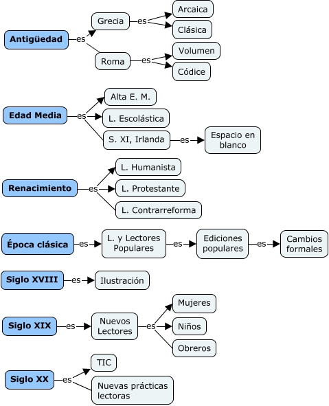 Este Cmap, tiene información relacionada con: Hitoria de la lectura 2, S. XI, Irlanda es Espacio en blanco, Antigüedad es Grecia, Renacimiento es L. Protestante, Siglo XX es Nuevas prácticas lectoras, Renacimiento es L. Contrarreforma, Época clásica es L. y Lectores Populares, Grecia es Arcaica, Edad Media es L. Escolástica, Siglo XVIII es Ilustración, Siglo XIX es Nuevos Lectores, Nuevos Lectores es Obreros, Roma es Volumen, Nuevos Lectores es Mujeres, Renacimiento es L. Humanista, Antigüedad es Roma, Edad Media es Alta E. M., Nuevos Lectores es Niños, Ediciones populares es Cambios formales, L. y Lectores Populares es Ediciones populares, Edad Media es S. XI, Irlanda