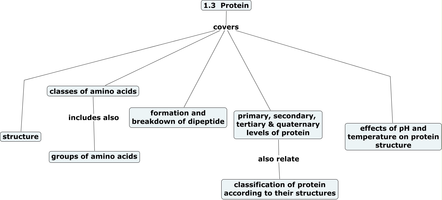 This Concept Map, created with IHMC CmapTools, has information related to: protein syllabus, 1.3 Protein covers primary, secondary, tertiary & quaternary levels of protein, 1.3 Protein covers structure, 1.3 Protein covers classes of amino acids, primary, secondary, tertiary & quaternary levels of protein also relate classification of protein according to their structures, 1.3 Protein covers formation and breakdown of dipeptide, 1.3 Protein covers effects of pH and temperature on protein structure, classes of amino acids includes also groups of amino acids